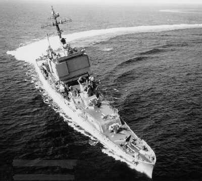 318K | Starboard bow view while underway. Note the AN/SPS-49 radar antenna on the platform mast aft. This was most likely added during her Mid-Life Conversion Phase II which was performed from 6 October 1980 to 26 March 1983. | Robert M. Cieri |