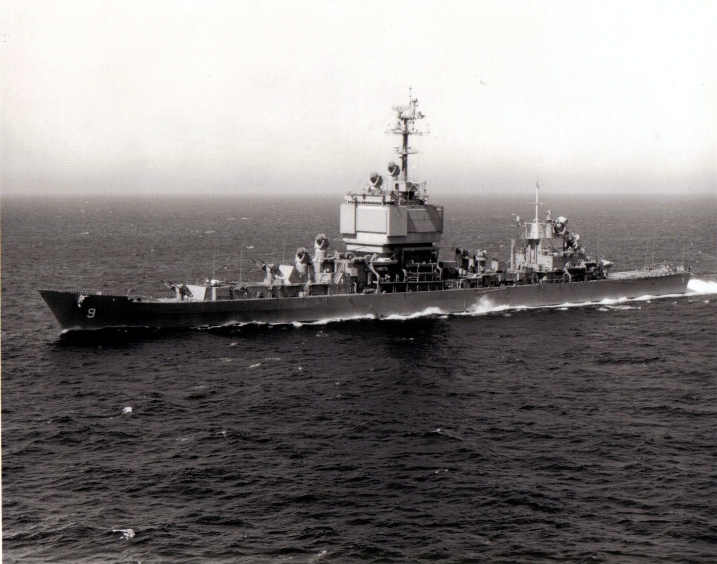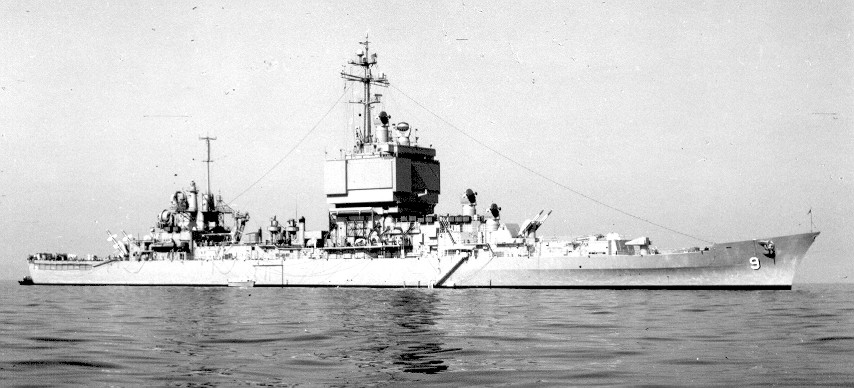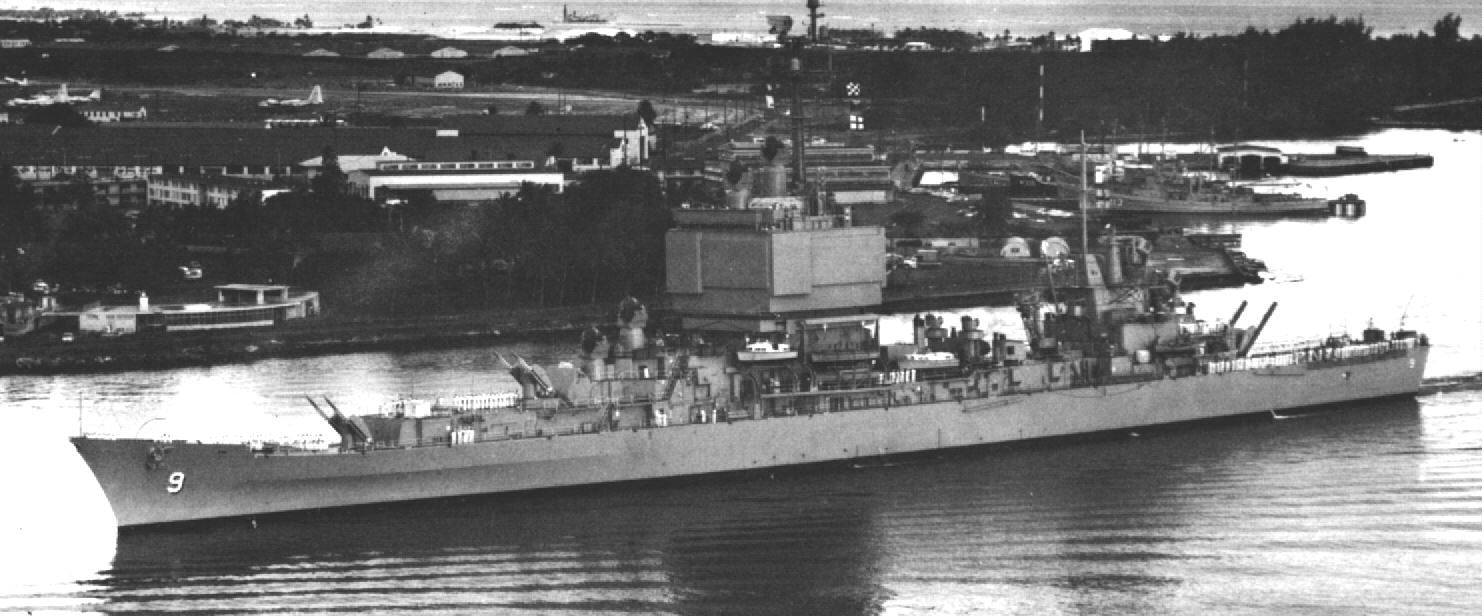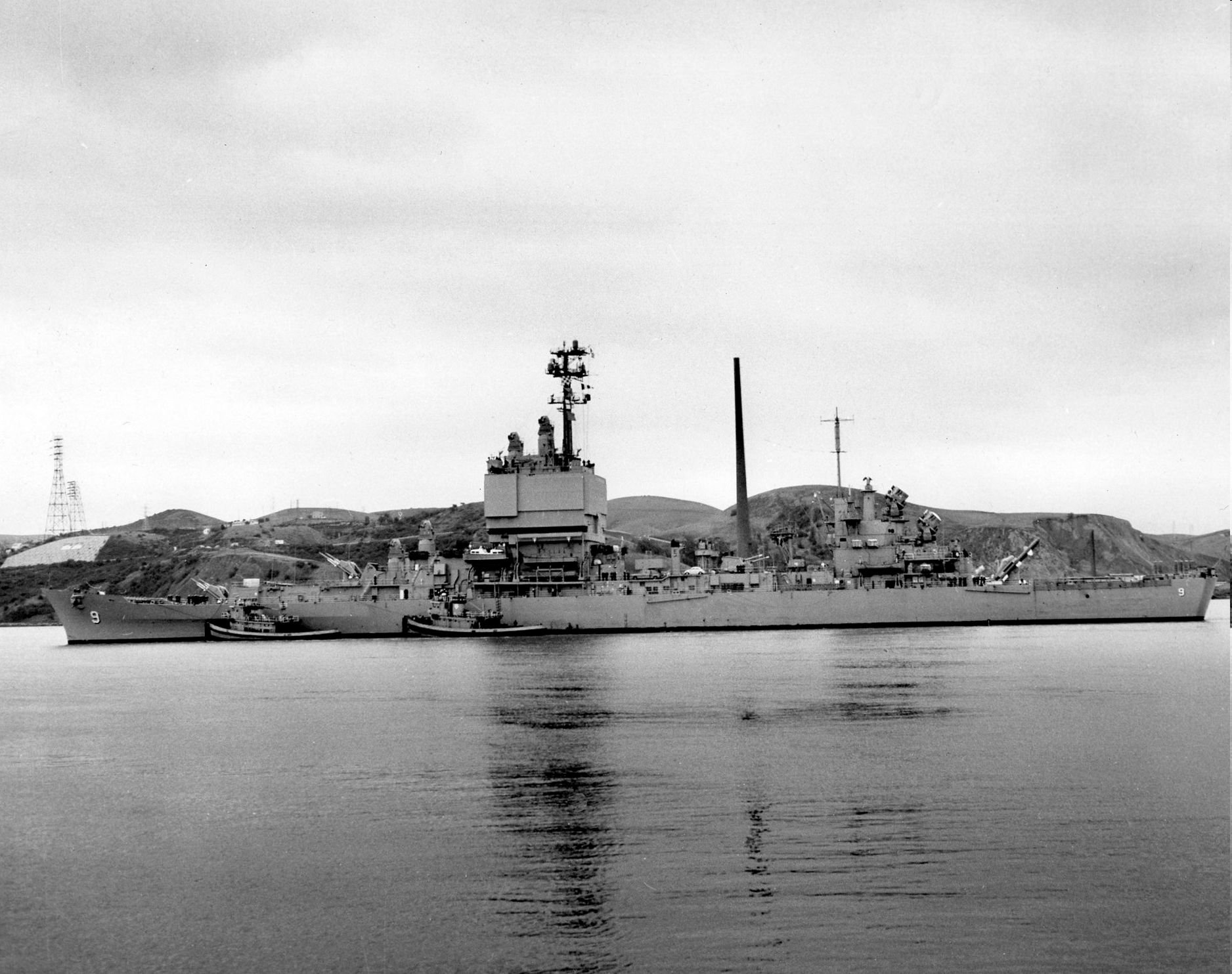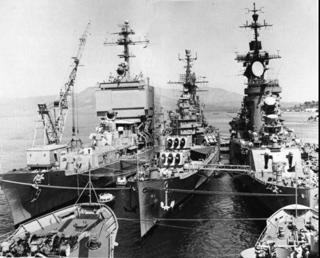 65k | 3 generations of USN cruisers, Long Beach moored outboard, A Cleveland Class Gun cruiser in the middle and a Baltimore class missile conversion moored inside. | USN |