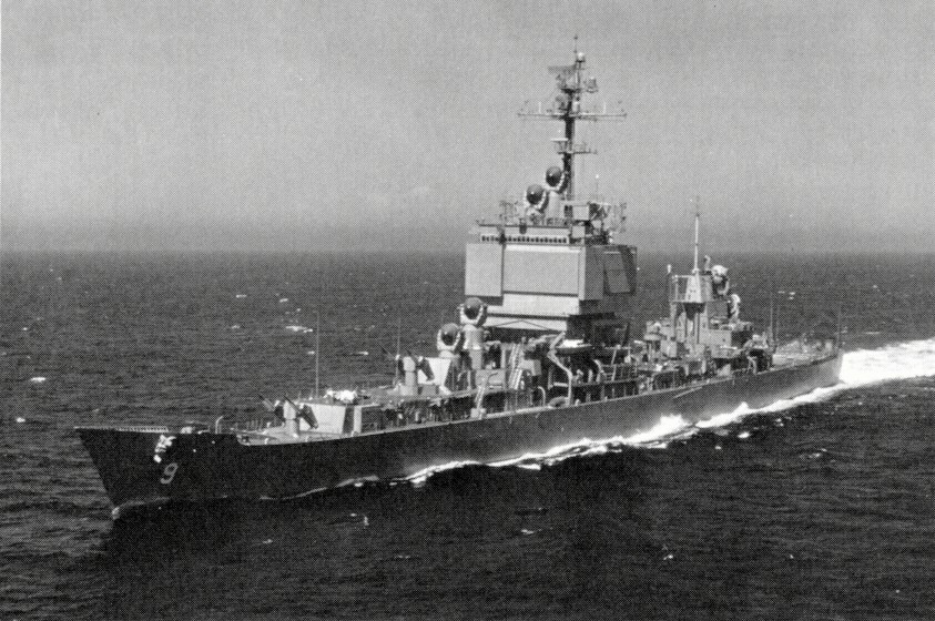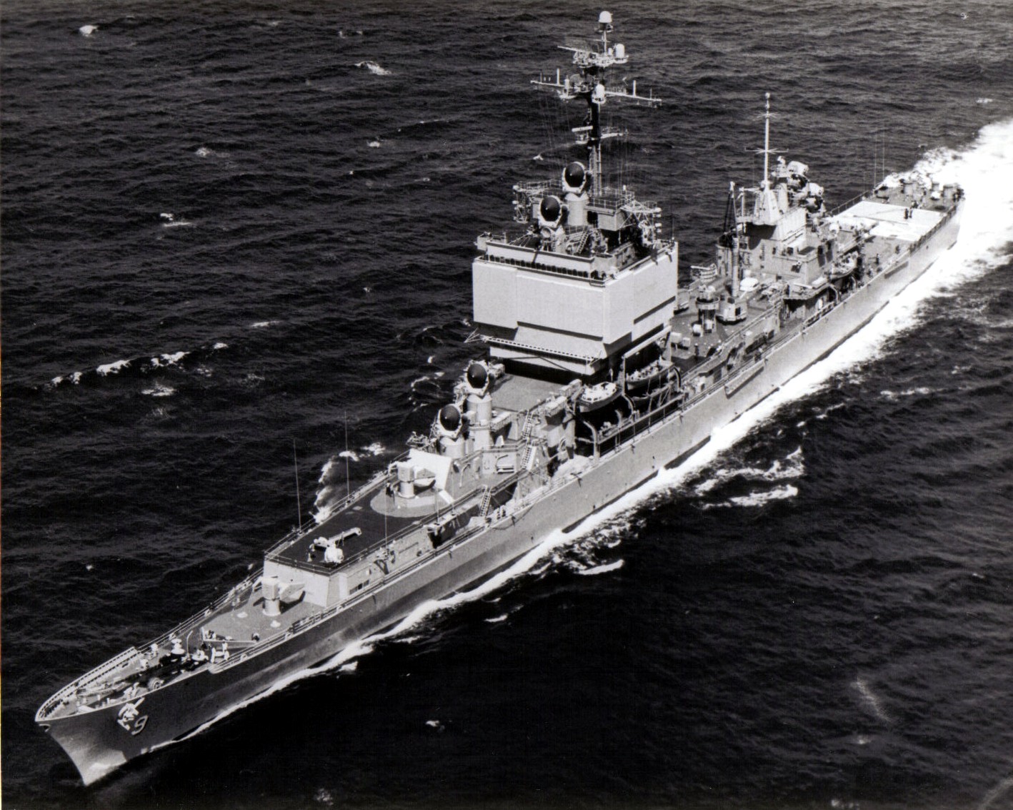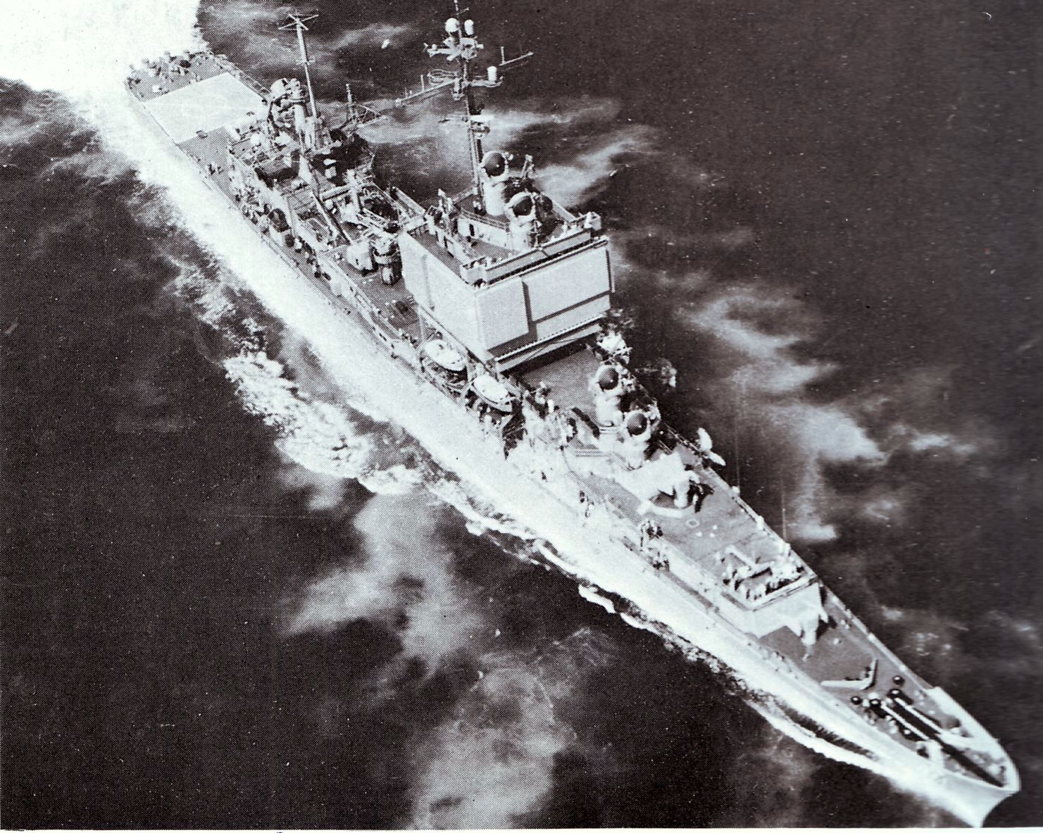 Port bow Aerial view while underway in Massachusetts Bay on her first Builder's Sea Trials from Bethlehem Steel Corporation Shipyard at Quincy, 7 July 1961. Note that the AN/SPS-33 antennas have not yet been installed on the superstructure, the ASROC launcher has not yet been placed midships. U.S. Navy photo #USN-1056851 |