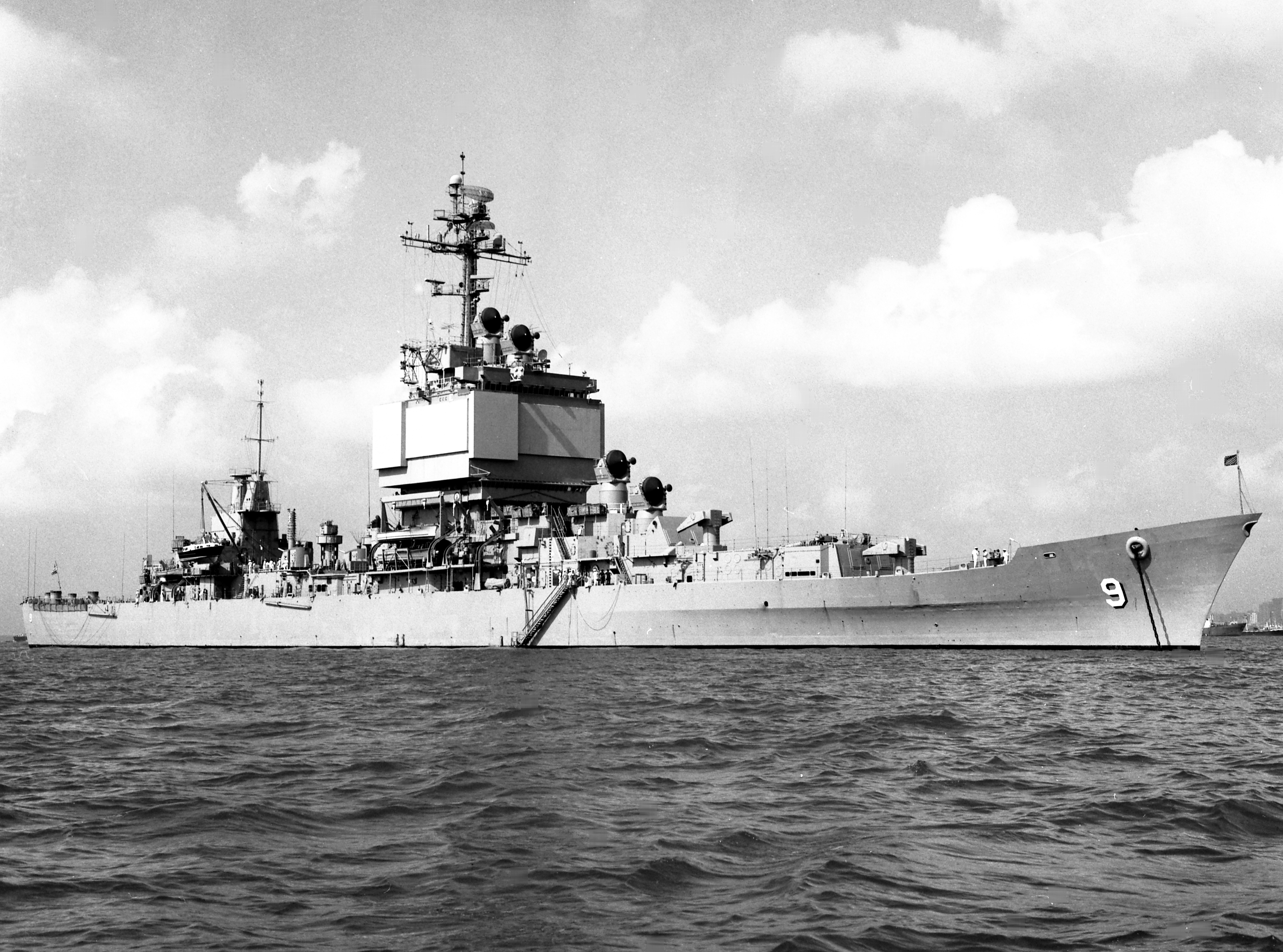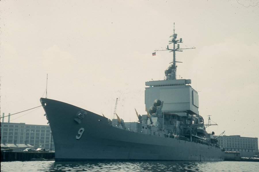 123k | USS Long Beach (CGN 9) entering Boston Harbor Early September 1961 prior to Commissioning on 9 September 1961. Picture taken from USS Boston (CAG 1) tie up at South Boston Annex Jetty. |