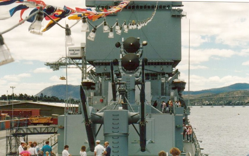 98k | Starboard view, looking forward at the after end of the forward superstructure while docked at Hobart, Australia during Christmas 1987. | Nick Jansen |