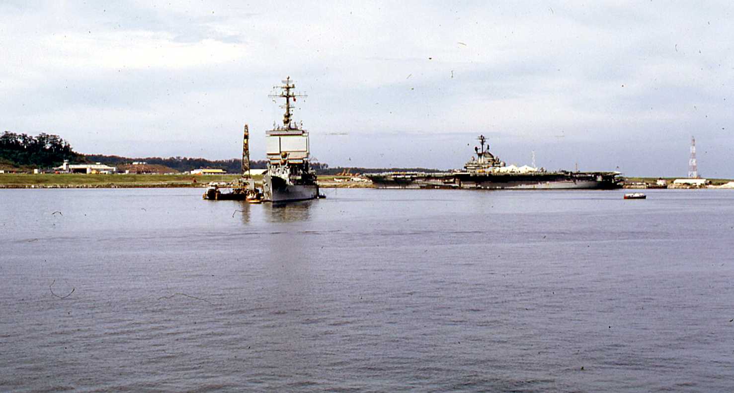 The USS Long Beach (CGN 9) and the USS Intrepid (CVS 11) at Subic Bay in June 1967. Photo taken from USS Evans (DE 1023). | Darryl Baker | |