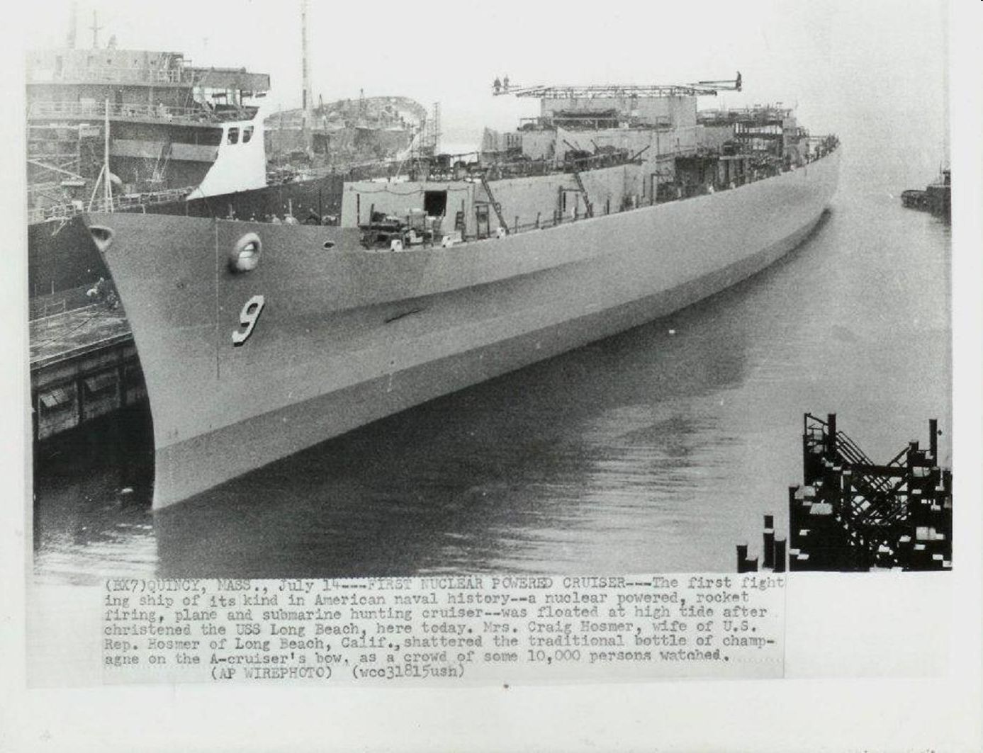 Caption: "(BX7) QUINCY, MASS., July 14---FIRST NUCLEAR POWERED CRUISER---The first fighting ship of its kind in American naval history--a nuclear powered, rocket firing, plane and submarine hunting cruiser--was floated at high tide after christened the USS Long Beach, here today. Mrs. Craig Hosmer, wife of U.S. Rep. Hosmer of Long Beach, Calif., shattered the traditional bottle of champagne on the A-cruiser's bow, as a crowd of some 10,000 persons watched. (AP WIREPHOTO) (wcc31815usn)" |