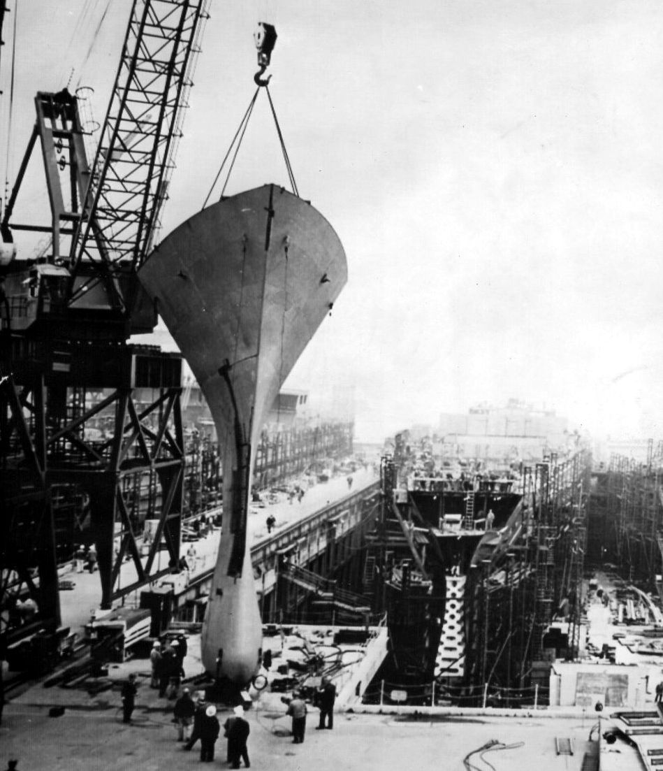 Long Beach is about to receive her bow at Quincy, MA in May 1959. From the Vallejo Naval and Historical Museum |
