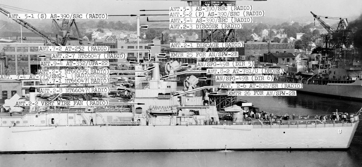 The following 4 photos identify all the antennas on the Long Beach. These photos were taken at Bethlehem Steel Company, probably just prior to her move to Boston for her commissioning. (caption updated by Bill Fessenden) Photo #rg19nn-b1579-001-062_pr from Record Group 19 at NARA II |
