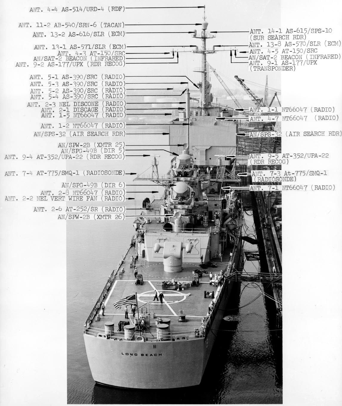 The following 4 photos identify all the antennas on the Long Beach. These photos were taken at Bethlehem Steel Company, probably just prior to her move to Boston for her commissioning. Note the Route 3A/Washington Street draw bridge in the background which identifies this location as the Weymouth Fore River. (caption updated by Bill Fessenden) Photo #rg19nn-b1579-001-065_pr from Record Group 19 at NARA II |