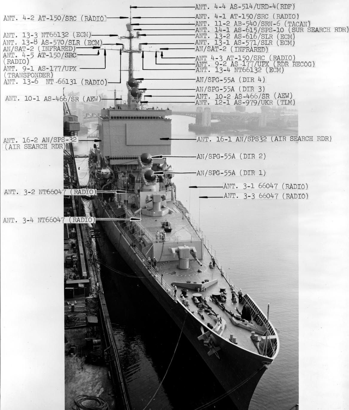 Long Beach, moored at Bethlehem Steel Company, 4 January 1960. Note the visible portions of the Hughes SCANFAR Radar (AN/SPS-32/33) on the superstructure. Photo #rg19nn-b1579-001-031_pr from Record Group 19 at NARA II |