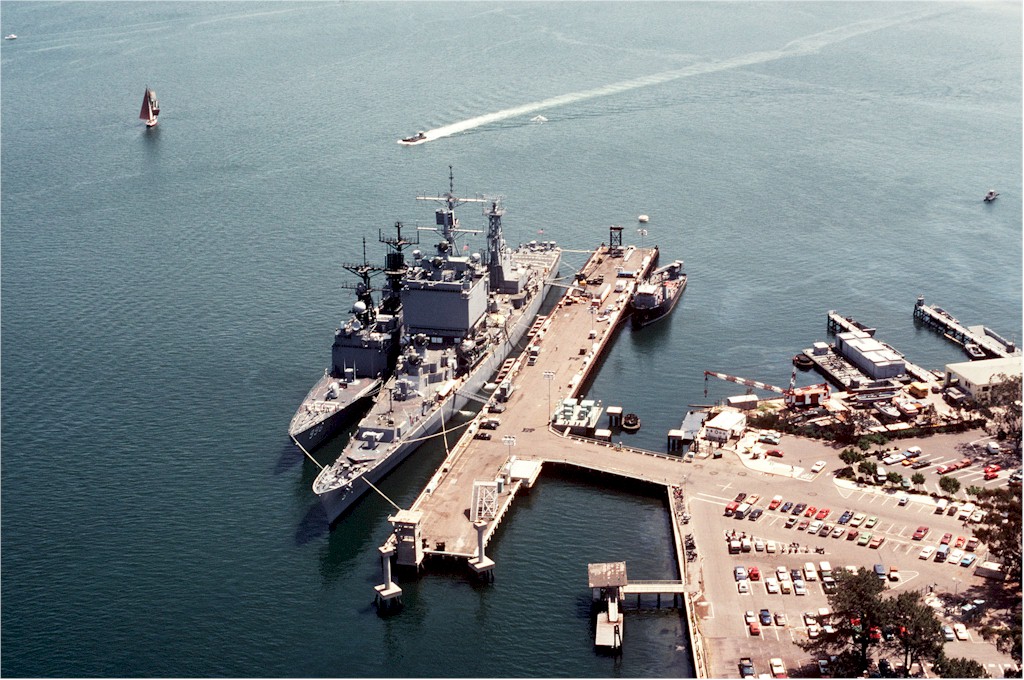 San Diego, CA, 9 April 1983 - Aerial port bow view of the nuclear-powered guided-missile cruiser USS Long Beach (CGN 9) moored to a pier at Naval Air Station North Island, with the guided-missile destroyer USS Chandler (DDG 996) nested outboard. U.S. Navy photo #DN-ST-86-01900 by: PHC L. Foster. |