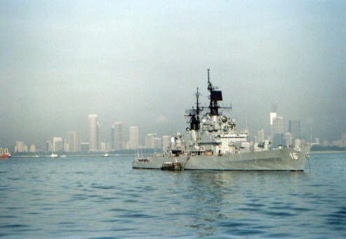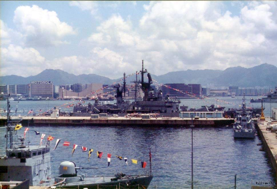 79k | Moored, starboard side to, Hong Kong harbor, August 1991. Outboard of USS Leahy is USS Rentz (FFG 46). Also visible are the Hong Kong fleet ships P239 Peacock and P240 Plover. | William Chiu |