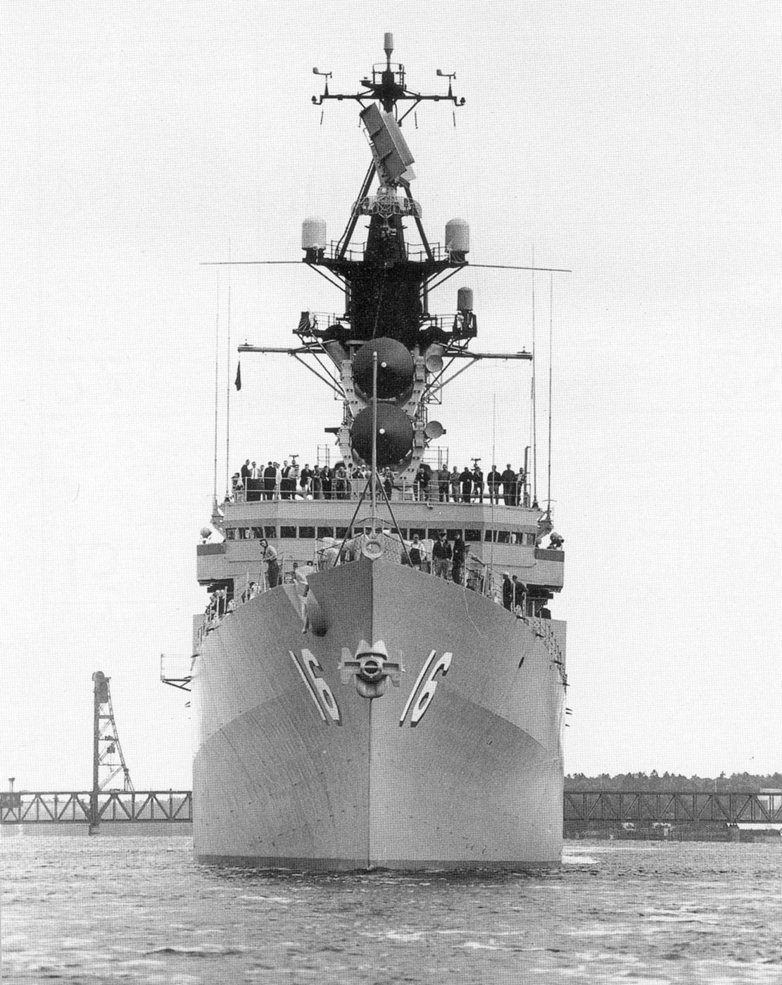 101k | 1 June 1968 photo of the Leahy emerging from the Philadelphia Navy Yard after her AAW modernization. Major improvements included installation of NTDS (Naval Tactical Data System) housed in a new amidships deckhouse, communication antennas on her bow, foremast mounted SPS-48 radar, and missile fire control systems and guidance radars mounted fore and aft. | USN | |