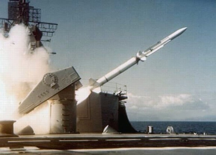 220k | 1 April 1983 - Pacific Ocean: A view of an RGM-84 surface-to-surface Harpoon missile, immediately after leaving a canister launcher aboard the cruiser USS Leahy (CG 16), near the Pacific Missile Test Center, Calif. USN Photo. |