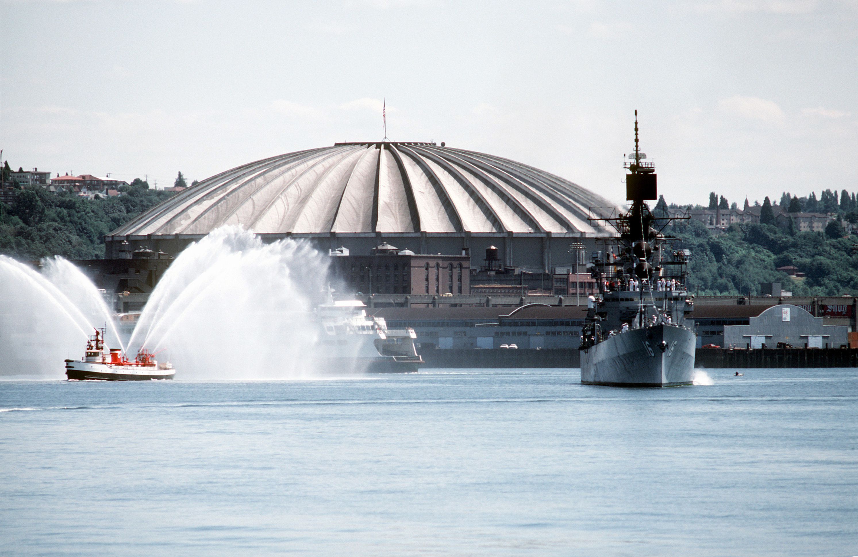 712k | USS Leahy (CG 16) arriving in port during the Seattle Sea Fair 1982, Washington, on 6 October 1982. A tug boat sprays water into the air to welcome her. The Kingdome Stadium is visible in the background. Photographer's Mate 1st Class Harold J. Gerwien, U.S. Navy. This is image is available in the holdings of the National Archives and Records Administration, cataloged under the National Archives Identifier (NAID) 6371846. |