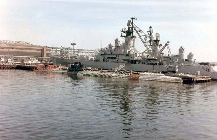 The Toro (SS 422) moored dockside at Pier 8, West of the Boston Naval Shipyard in 1963. The ship on the opposite side of Pier 8 is USS Leahy (DLG 16). U.S. Navy photo # 14452-1 |