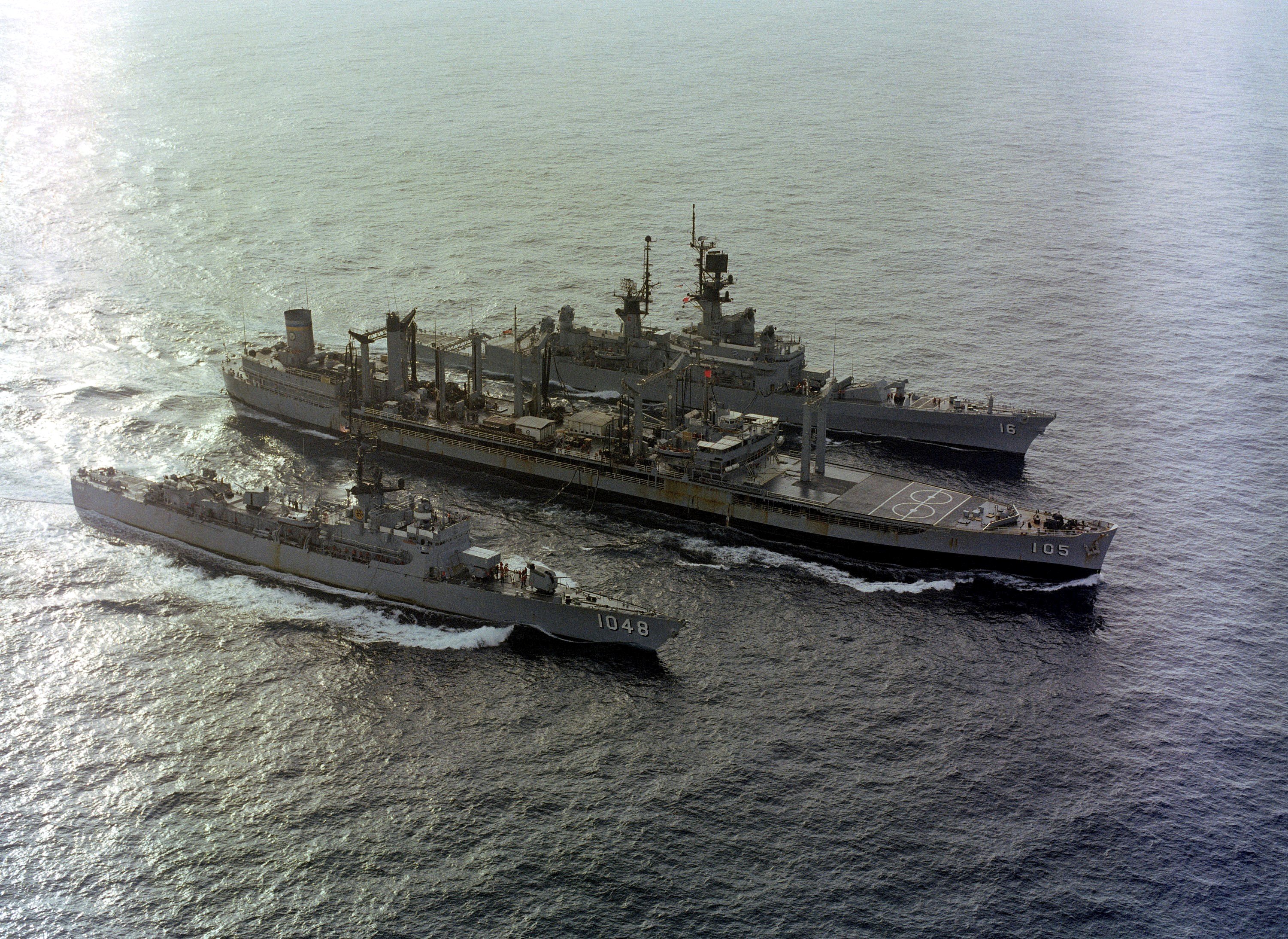 Oblique port bow view of (front to back) the aircraft carrier USS Constellation (CV 64), USS Niagara Falls (AFS 3) and the guided missile cruiser USS Leahy (CG 16) underway, December 1979. US Navy photo (DVIC id: DNST8511030). |