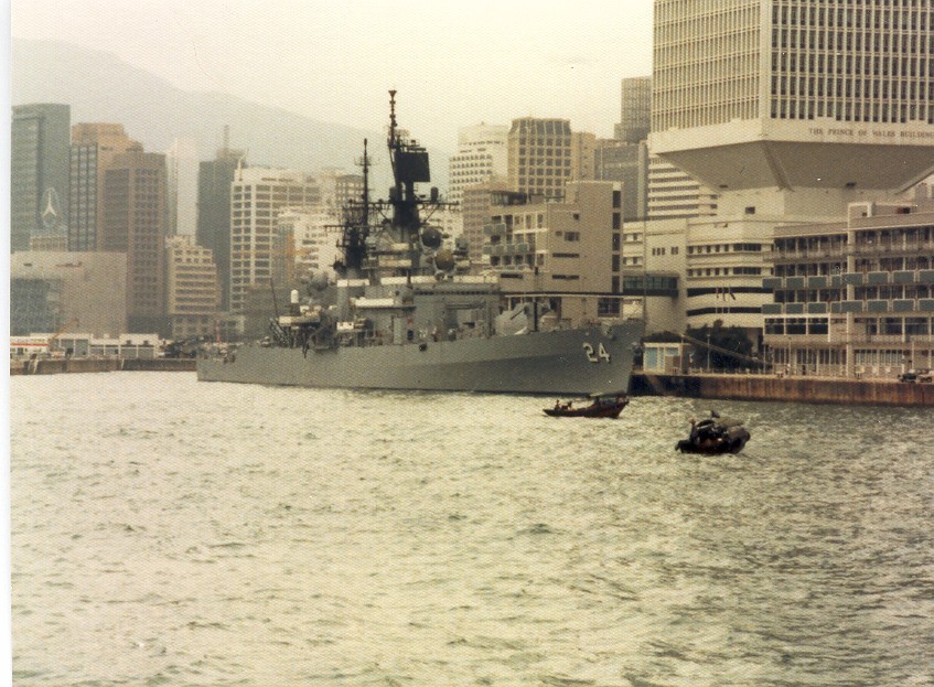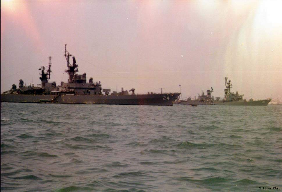 57k | Starboard side view at anchor, Hong Kong harbor, April 1989. USS Cochrane (DDG 21) is also visible. | William Chiu |