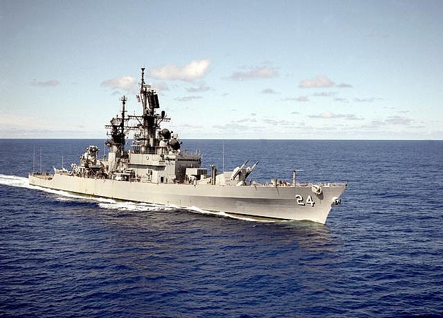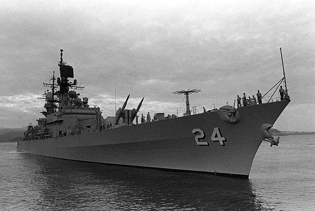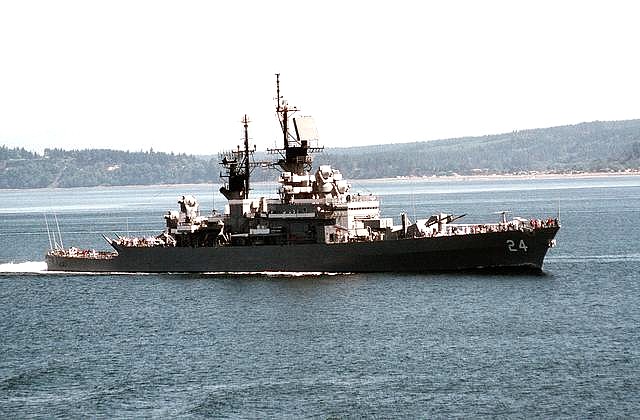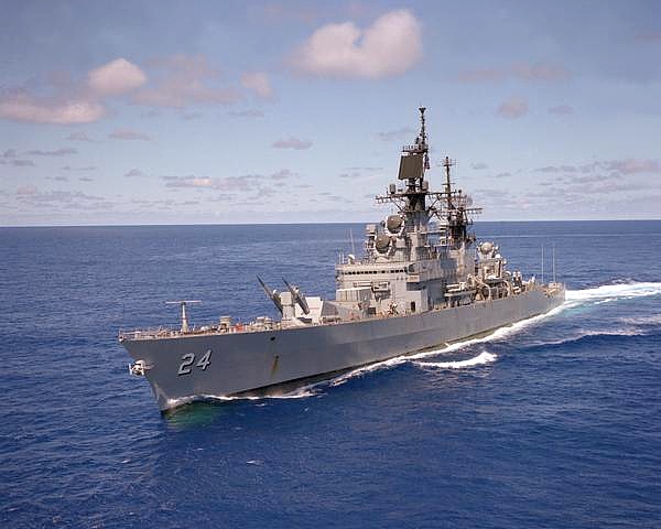 CLASS - LEAHY Displacement 7,400 Tons, Dimensions, 533' (oa) x 53' 6" x 25' 3" (Max) Armament 2 Terrier 2x2, (80 Missiles) 4 x 3"/50, ASROC (8 Missiles) 6 x12.75" TT. Machinery, 85,000 SHP; Geared Turbines, 2 screws Speed, 34 Knots, Crew 377. Operational and Building Data Keel laid on 01 JUL 1960 by the Puget Sound Navy Yard, Bremerton, WA Launched 12 MAY 1962 Commissioned 15 MAY 1964 Reclassified CG 24 30 JUN 1975 Accidentaly hit by 500lb bomb from USS Midway plane 30 OCT 1989 Decommissioned 12 NOV 1993 Stricken 12 NOV 1993 Fate: Sunk as target 31 MAY 2001 026° 26’ 53.0 S 155° 24’ 27.0 E 2541 Fathoms |