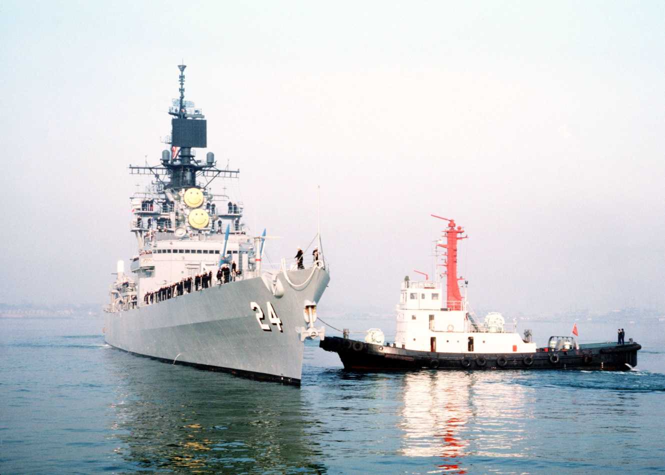 05 November 1986 -- A harbor tug assists the guided missile cruiser USS Reeves (CG 24) as it prepares to dock at a pier. Accompanying the ship are the guided missile frigate USS Rentz (FFG 46) and the destroyer USS Oldendorf (DD 972). This is the first visit by US Navy (USN) ships to China in 40 years. Photo taken by PH1 Charles L. Mussi. U.S. Navy photo #DN-ST-87-02233 |