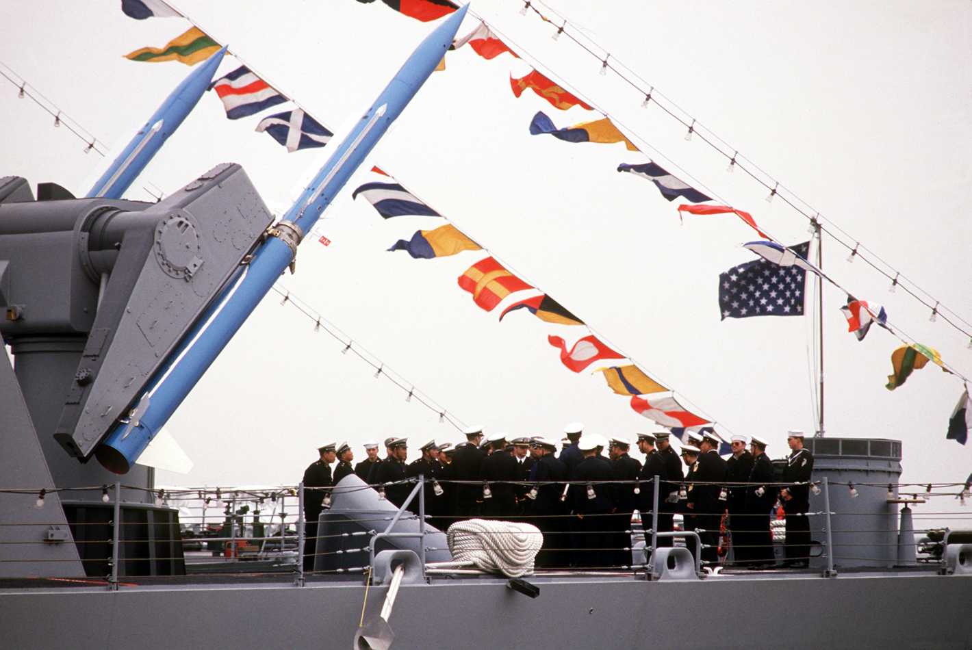USS Reeves (CG 24), near a pair of RIM-67B Standard (SM-2 ER) missiles