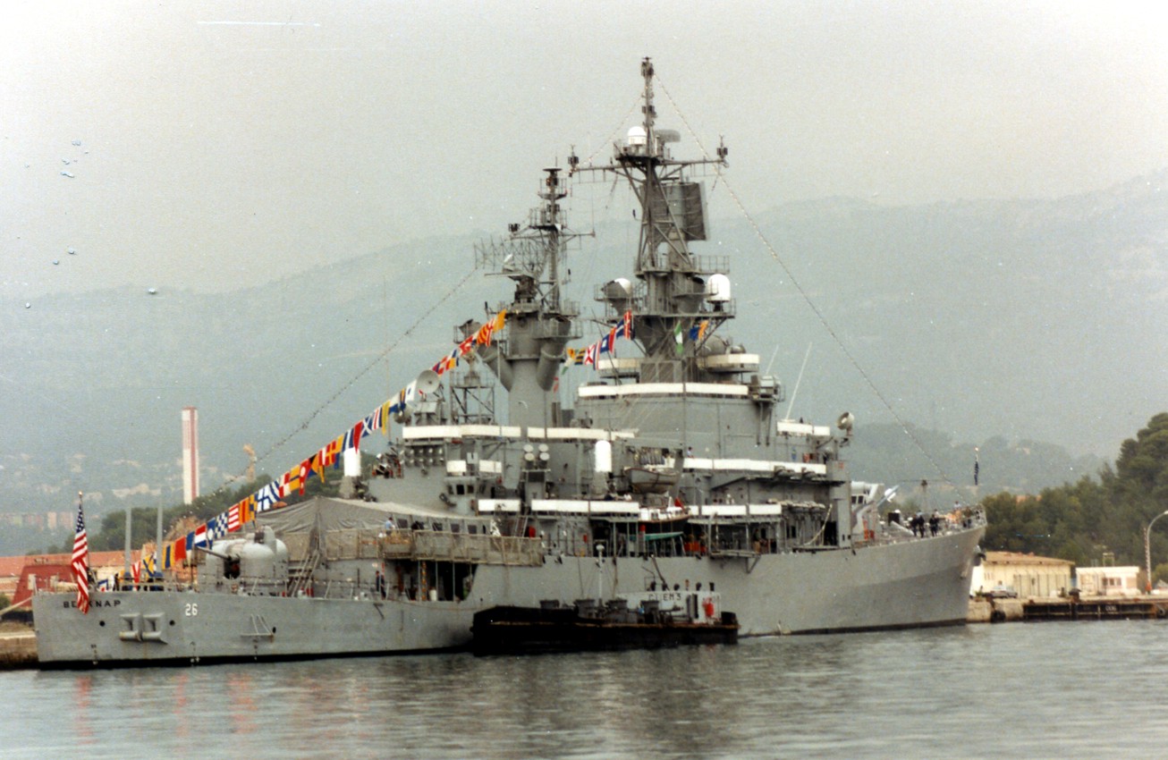 68k | Belknap taken sometime in 1985. After her collision with USS John F. Kennedy (CV 67), she was rebuilt then selected to serve as flagship for Commander Sixth Fleet. This is the flagship configuration. Note the added deck house in front of the superstructure. | Demetrius J. C. Carter SM1 USN |