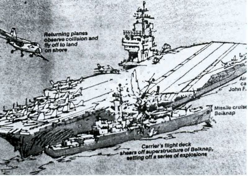 2.3m | A view of interior damage sustained by the guided missile cruiser USS Belknap (CG 26) when it collided with the aircraft carrier USS John F. Kennedy (CV 67) during night operations on 22 November 1975. National Archives photo #6420097 |