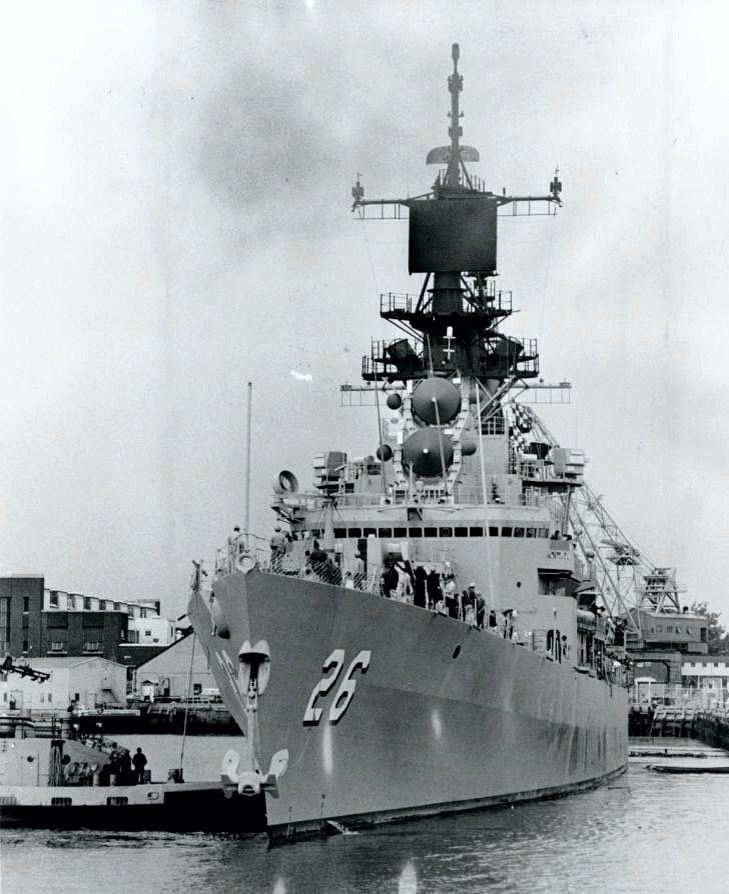 CLASS - BELKNAP Displacement 8,957 Tons, Dimensions, 547' (oa) x 54' 10" x 29' (Max) Armament 1 Terrier/ASROC (60 Missiles) 1 x 5"/54RF, 2 x 3"/50, 6 x12.75" TT. Machinery, 85,000 SHP; Geared Turbines, 2 screws Speed, 34 Knots, Crew 400. Operational and Building Data Keel laid on 05 FEB 1962 by Bath Iron Works, Bath, ME Launched 20 July, 1963 Commissioned 07 NOV 1964 Reclassified CG 26 on 30 JUN 1975 Collided with USS John F. Kennedy (CV 67) on 22 NOV 1975 in the Ionian Sea. The following seven crew members were killed: MM1 James W. Cass MM2 Douglas S. Freeman EM2 Michael W. Kawola DS3 Gerald A. Ketcham STG3 Brent W. Lassen FA David A Messmer DS2 Gordon T. St. Marie 47 crew members were injured One member of the Kennedy crew was killed: YN2 David A Chivalette Decommissioned 20 DEC 1975 Commissioned MAY 1980 Decommissioned 15 FEB 1995 Stricken 15 FEB 1995 Fate Sunk as target on 24 SEP 1998 036° 31' 00.3" North 071° 58' 00.5" West 2050 fathoms |