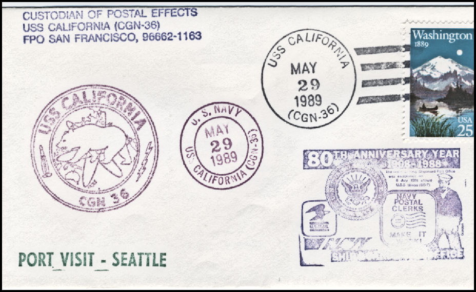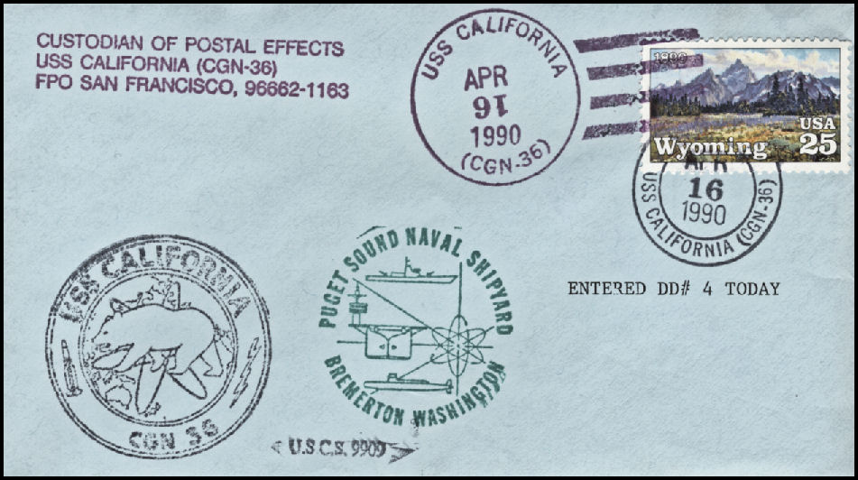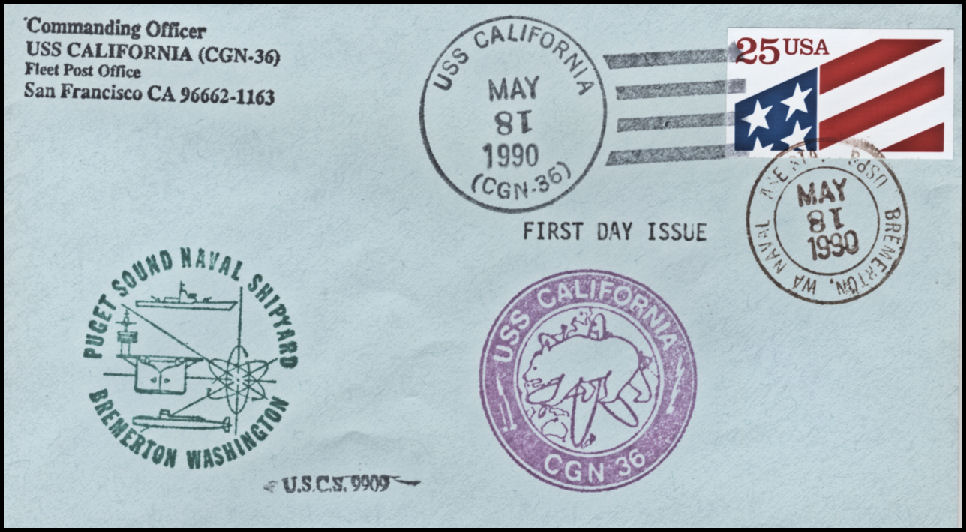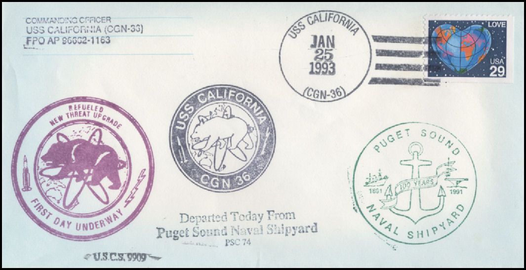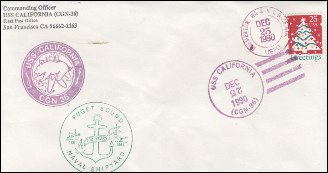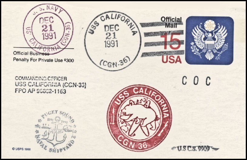 106k | Postal cover, shortly after entering PSNS for a 3 year refueling overhaul, 18 May 1990. | Tom Armstrong | |
