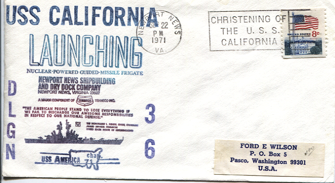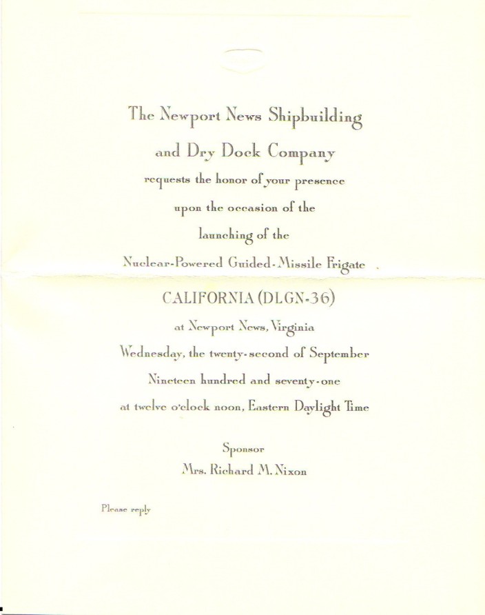 57k | Launching Invitation for USS California (DLGN 36) on 22 September 1971 at Newport News Shipbuilding and Dry Dock Company. | Robert M. Cieri | |