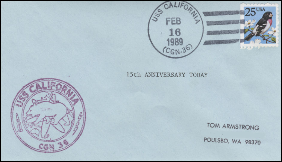 79k | Fifteenth anniversary of commissioning postal cover, 16 February 1989. | Tom Armstrong | |