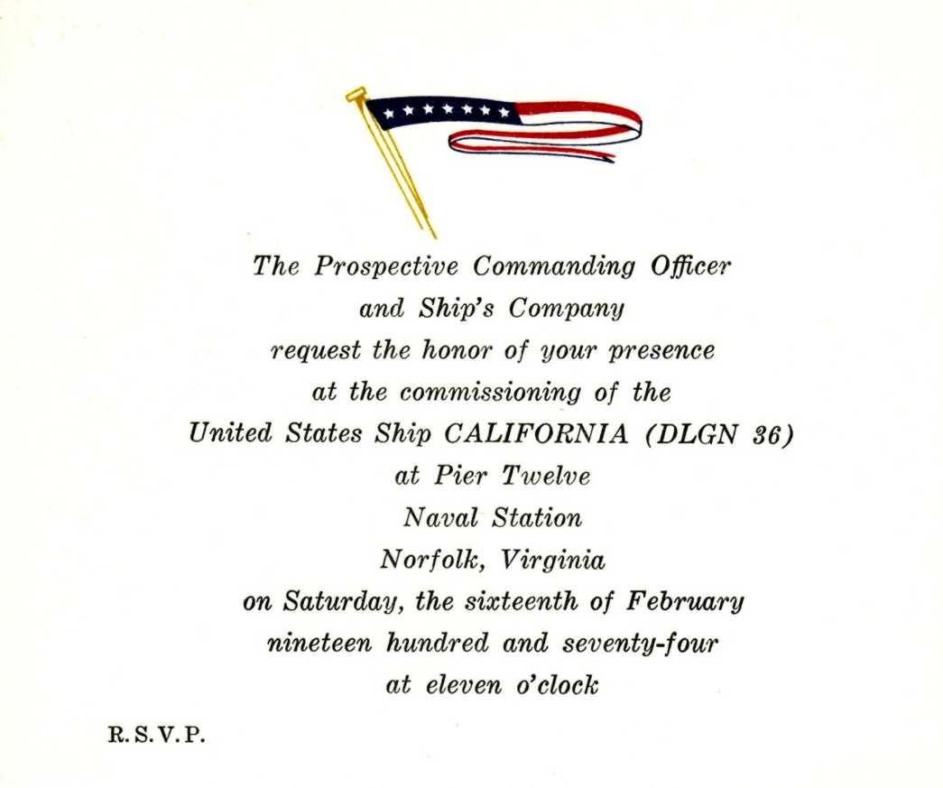 41k | Commissioning Invitation for the USS California (DLGN 36), held at Naval Station Norfolk on 16 February 1974. | Robert M. Cieri | |