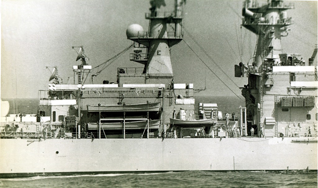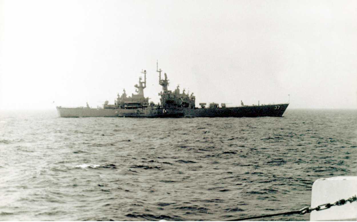 USS South Carolina at anchor with the USS Grand Rapids (PG 98) moored along side in the Kithira Strait off of Greece on 8 August 1976. View from the Soviet ship Krasny Krim ( Kashin class DDG). |