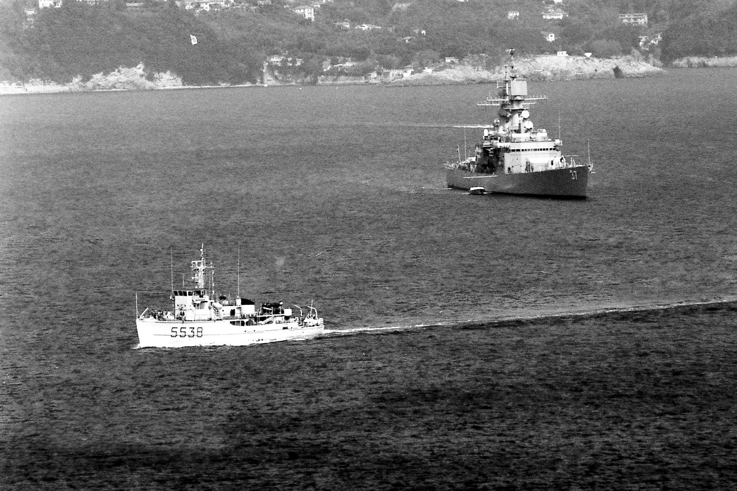 405k | Italian Minesweeper Loto (M5538) passing USS South Carolina (CGN 37), 28 April 1987. La Spezia, Italy. | Carlo Martinelli | |