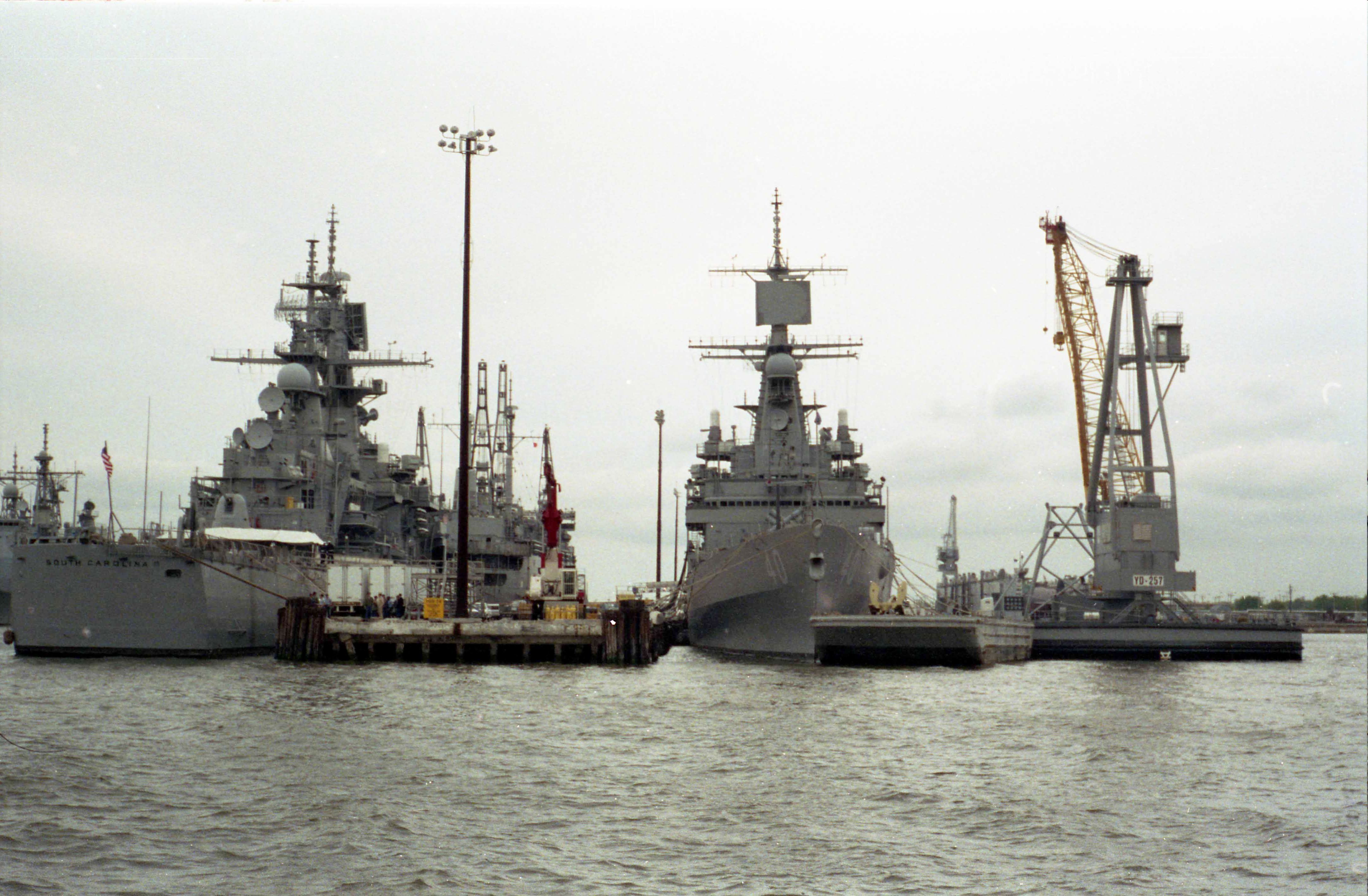 1m | Bow view of USS Mississippi (CGN 40) (right) and stern view of USS South Carolina (CGN 37) (left) while moored at Norfolk Naval Station, 1994. Floating Crane YD-257 is to the right of Mississippi and the barge between them has her bow anchor resting on it. | Cody Shaffer | |
