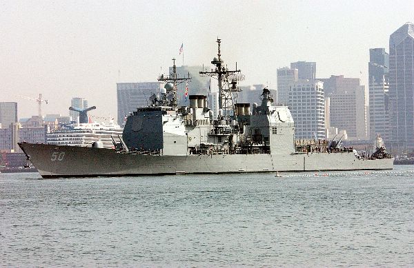 55k | The guided missile cruiser USS Valley Forge (CG 50) heads out of San Diego bay to begin their regularly scheduled six-month deployment after pulling away from the pier at Naval station 32nd street. 2 November 2002 | Steven A. Cardali |