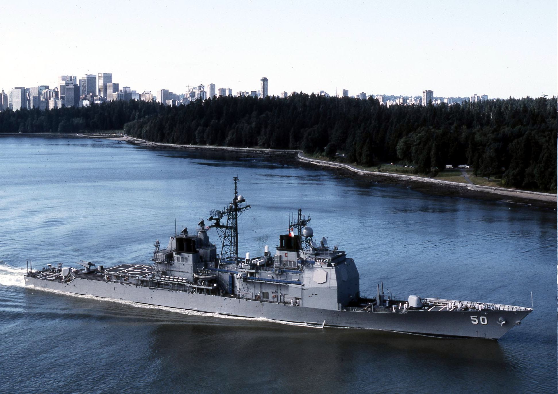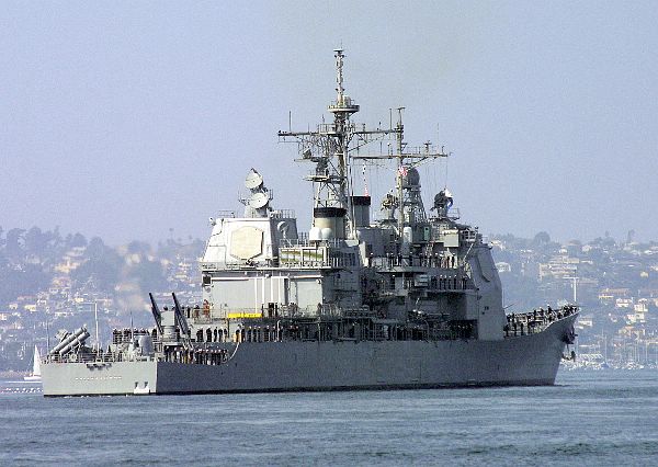 63k | The guided missile cruiser USS Valley Forge (CG 50) heads out of San Diego bay to begin their regularly scheduled six-month deployment after pulling away from the pier at Naval station 32nd street. 2 November 2002 | Steven A. Cardali |