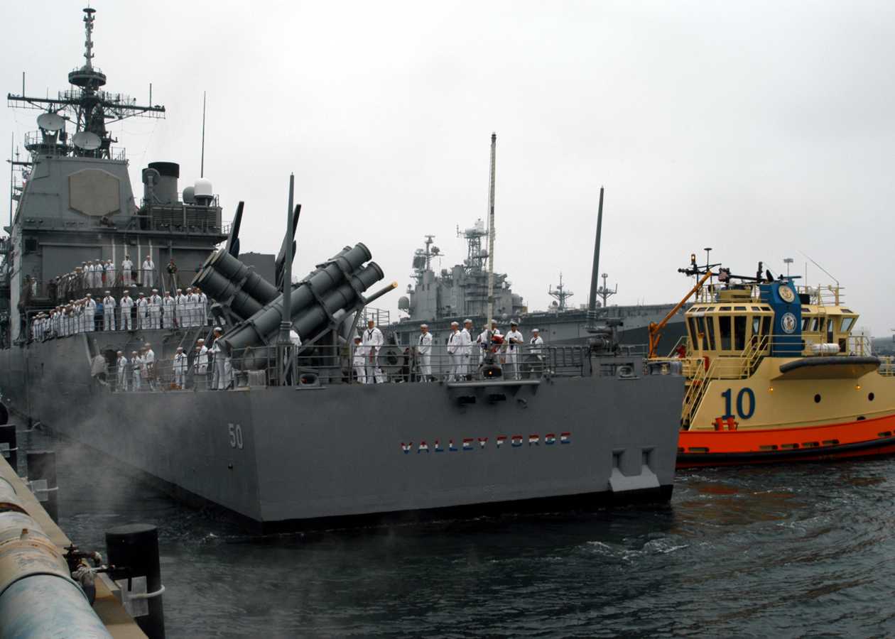 Naval Station San Diego, CA, 2 June 2003 - USS Valley Forge (CG 50) is assisted toward the pier by tugs at Naval Station, San Diego as the guided missile cruiser returns from a deployment in support of Operation Enduring Freedom and Operation Iraqi Freedom. USS Bataan (LHD 5) is seen in the background. U.S. Navy photo #030602-N-6132R-008 by Photographer's Mate 2nd Class Louis Rojas. |