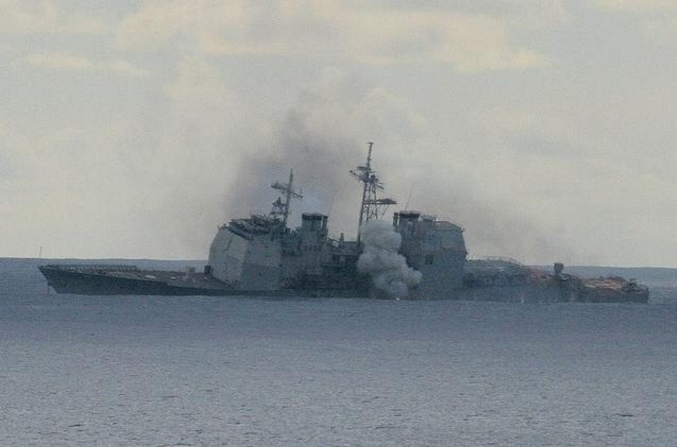 87k | ex-Valley Forge, listing to port during her SINKEX on 02 November 2006. | Eric Bentz |