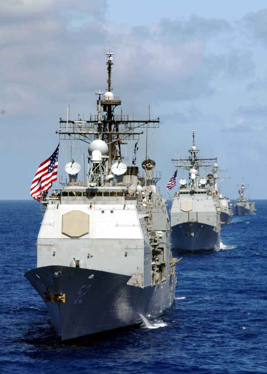 October 2003 - Ships belonging to the USS Constellation (CV-64) Battle Group parade their colors during an a airshow on board Constellation. From front to rear: USS Bunker Hill (CG-52), USS Valley Forge (CG-50), USS Milius (DDG-69), and USS Thach (FFG-43). The carrier was decommissioned in August 2003. U.S. Navy photo #030529-N-9076B-010 by PHC Donald Bray |