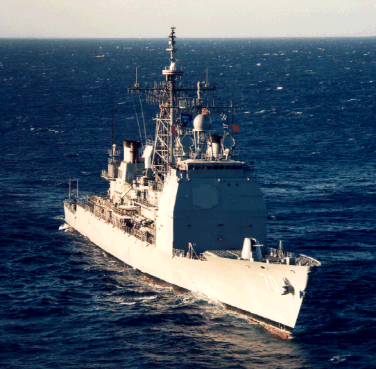 CLASS - TICONDEROGA (Flight II) Displacement 9,589 (FL) Tons, Dimensions, 565' 10" (oa) x 55' x 31' 6" (Max) Armament 2 x 5"/54RF, 2 VLS, (122 Missiles) 2 x 20mm Phalanx CIWS, 2 x 25mm Bushmaster mg. 6 x12.75" TT. 2 LAMPS Helos. Machinery, 80,000 SHP; G.E. Gas Turbines, 2 screws Speed, 30+ Knots, Crew 370. Operational and Building Data Keel laid on 06 MAR 1990 by Bath Iron Works in Bath, ME Launched 13 JUL 1991 Commissioned 24 JUL 1993 Home port: San Diego, CA |