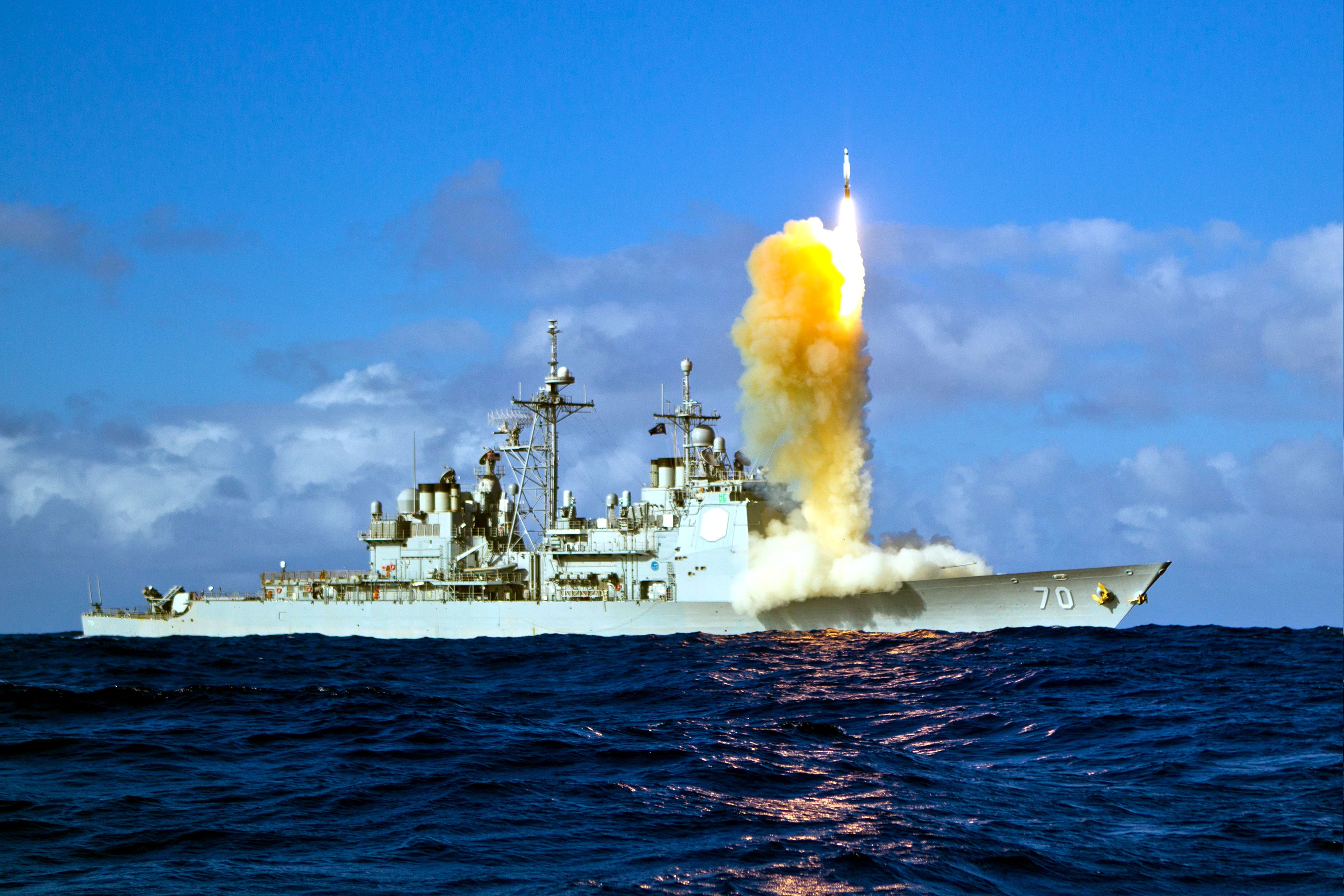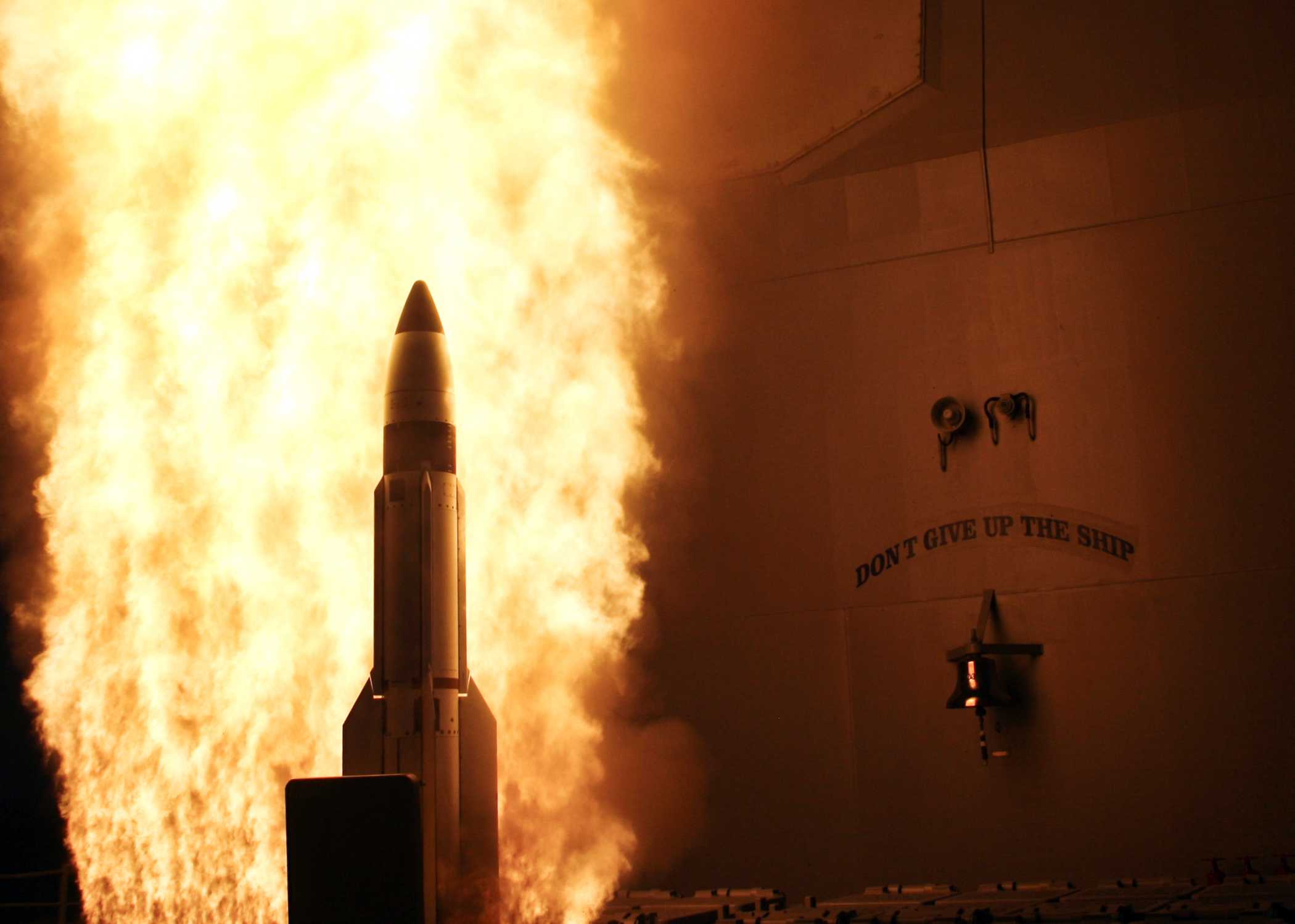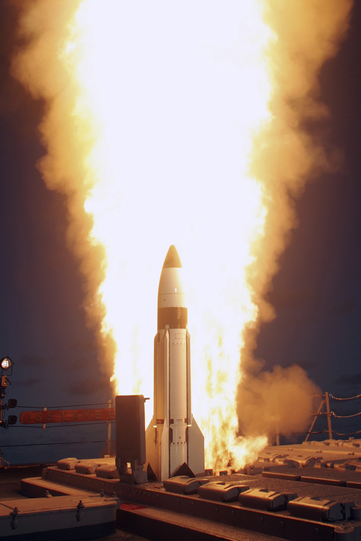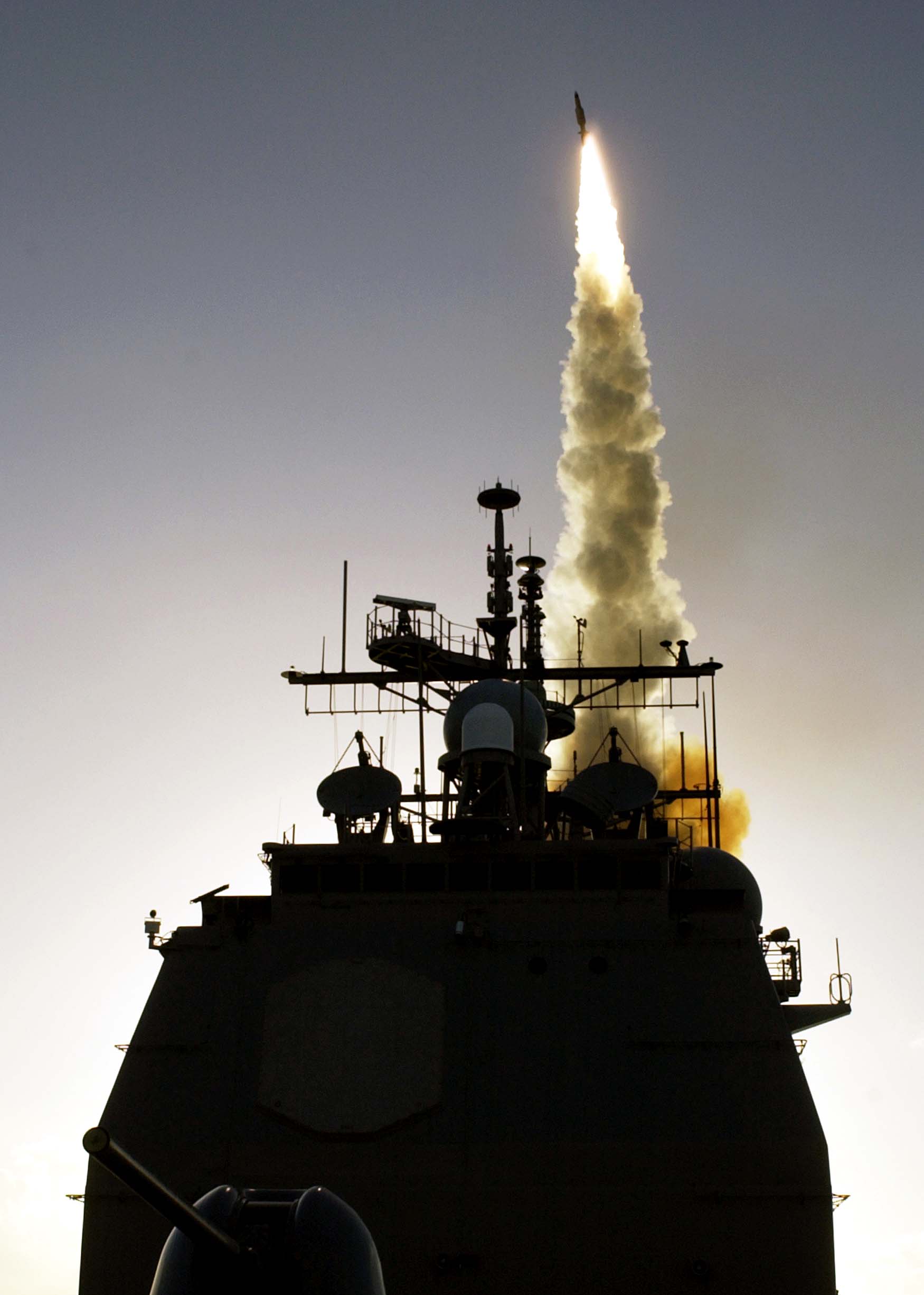 17 November 2005 - Standard Missile - 3 (SM-3) is launched from the Pearl Harbor-based Aegis cruiser USS Lake Erie (CG-70), during a joint Missile Defense Agency, U.S. Navy ballistic missile flight test today. Minutes later, the SM-3 intercepted a separating ballistic missile threat target, launched from the Pacific Missile Range Facility, Barking Sands, Kauai, Hawaii. The test was the sixth intercept, in seven flight tests, by the Aegis Ballistic Missile Defense, the maritime component of the "Hit-to-Kill" Ballistic Missile Defense System, being developed by the Missile Defense Agency. All previous Aegis Ballistic Missile Defense flight tests were against unitary (non-separating) targets. U.S. Navy Photo |