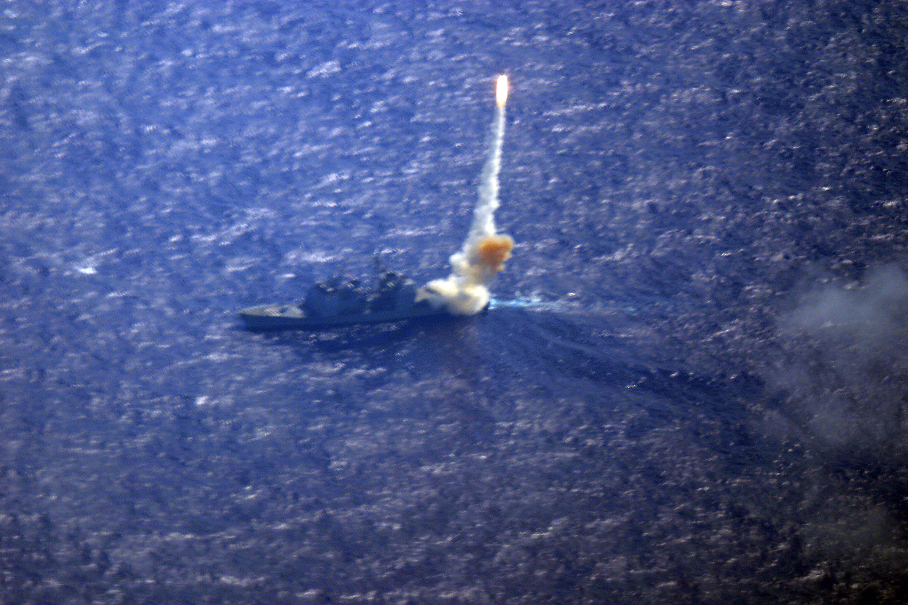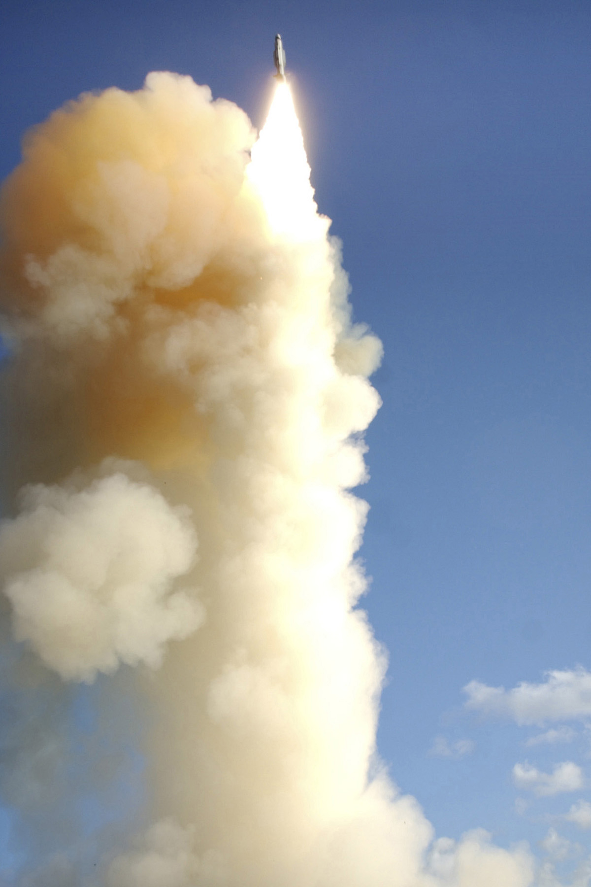 12 December 2003 - An SM-3 is launched from the Aegis cruiser USS Lake Erie as part of the Missile Defense Agency's latest Ballistic Missile Defense System test to defeat a medium-range ballistic missile threat. The missile, part of the Aegis Weapon System, intercepted a target launched from the Pacific Missile Range Facility on the Hawaiian island of Kauai 11 December. This was the fourth successful intercept for Aegis BMD and SM-3. The test included evaluation of the long-range surveillance and tracking capabilities of two Navy ships as well as effective communications between the ships and command and control units. U.S. Navy photo. |