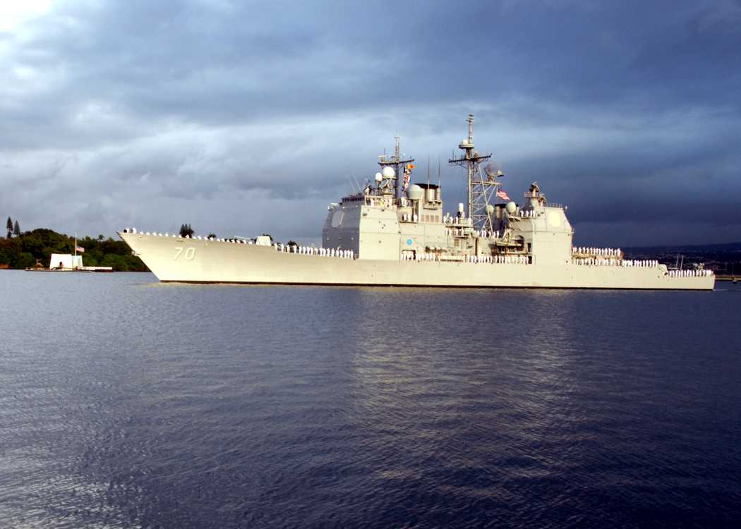PEARL HARBOR, Hawaii, 22 February 2008 - The Ticonderoga class guided-missile cruiser USS Lake Erie (CG 70) passes the Battleship Missouri Memorial as she makes her way pier side at Naval Station Pearl Harbor. Lake Erie fired a modified Standard Missile-3 (SM-3) on 20 February, which successfully destroyed a malfunctioning U.S. reconnaissance satellite approximately 247 kilometers (133 nautical miles) over the Pacific Ocean traveling in space at more than 17,000 mph. U.S. Navy photo # 080222-N-4965F-549 by Mass Communication Specialist 1st Class James E. Foehl. |