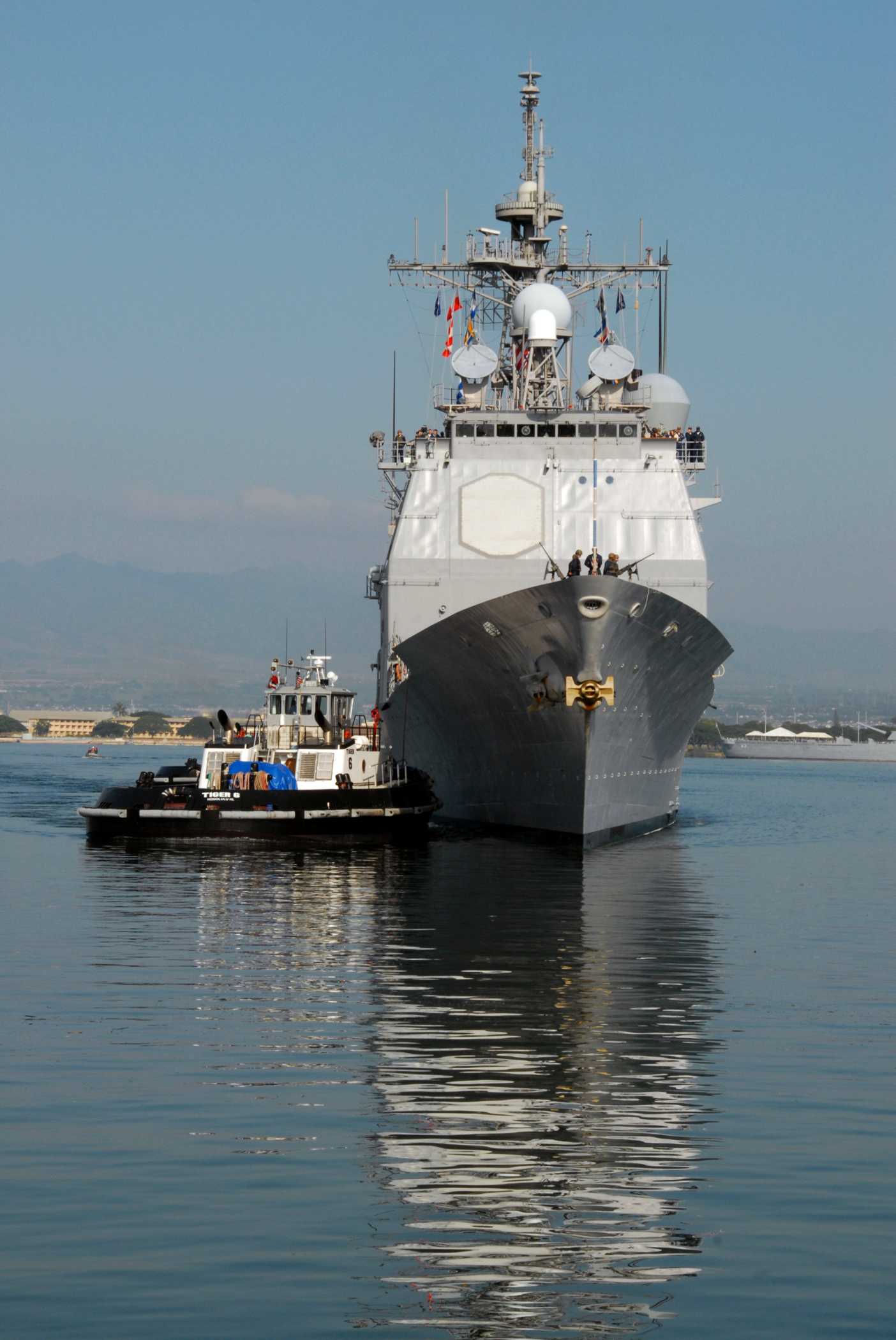 PEARL HARBOR, Hawaii, 26 June 2008 - The guided-missile cruiser USS Lake Erie (CG 70) arrives at Naval Station Pearl Harbor for Rim of the Pacific (RIMPAC) 2008. RIMPAC is the world's largest multinational exercise and is scheduled biennially by the U.S. Pacific Fleet. Participants include the United States, Australia, Canada, Chile, Japan, the Netherlands, Peru, Republic of Korea, Singapore, and the United Kingdom. U.S. Navy photo #080626-N-6674H-048 by Mass Communication Specialist 2nd Class Paul D. Honnick. |