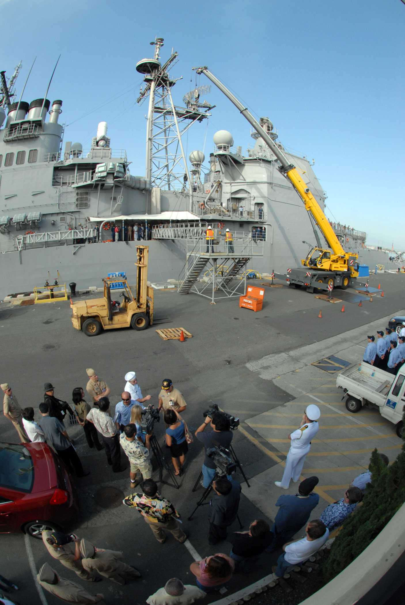 2 July 2004 - The U.S. Navy guided missile cruiser USS Lake Erie (CG 70) proudly displaying its golden bow anchor, pierside at Naval Station Pearl Harbor, Hawaii. The golden anchor symbolizes a high retention rate of shipboard personnel. The ship is participating in this year's Rim of the Pacific (RIMPAC) exercise 2004. RIMPAC is the largest international maritime exercise in the waters around the Hawaiian Islands. This years exercise includes seven participating nations; Australia, Canada, Chile, Japan, South Korea, United Kingdom and United States. RIMPAC is intended to enhance the tactical proficiency of participating units in a wide array of combined operations at sea, while enhancing stability in the Pacific Rim region. U.S. Navy photo #040702-N-4304S-006 by Photographer's Mate 2nd Class Bradley J. Sapp. |