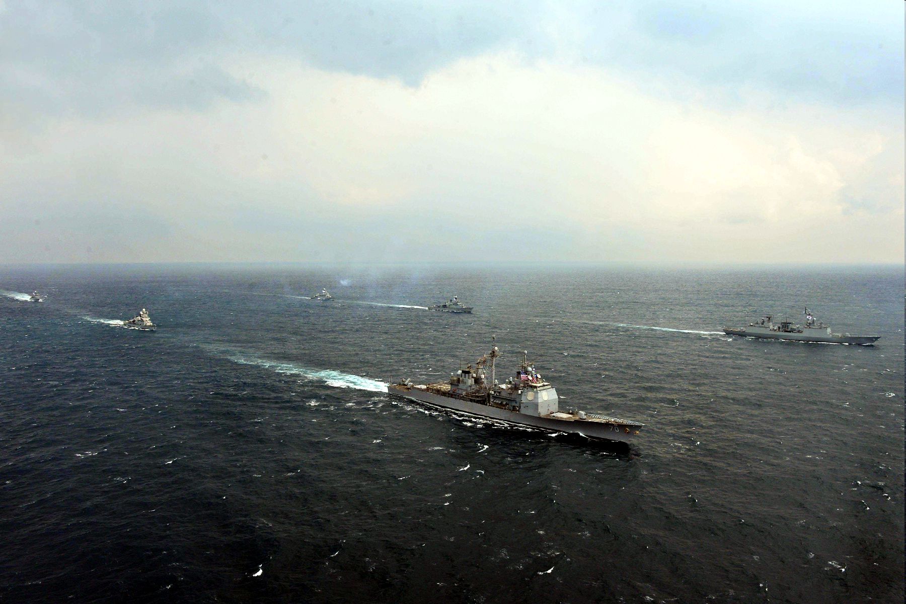 WATERS TO THE SOUTH OF THE KOREAN PENINSULA, 17 March 2014 - The Ticonderoga-class guided-missile cruiser USS Lake Erie (CG 70) performs maneuvers with the Republic of Korea Navy class two destroyer ROKS Wang Geon (DDH-978) and other Republic of Korea Navy ships in waters off the coast of the Korean peninsula. Lake Erie is underway in the U.S. 7th Fleet area of responsibility supporting security and stability in the Indo-Asia Pacific region. U.S. Navy photo #140318-N-ZZ999-005 courtesy of the Republic of Korea Navy/Released |