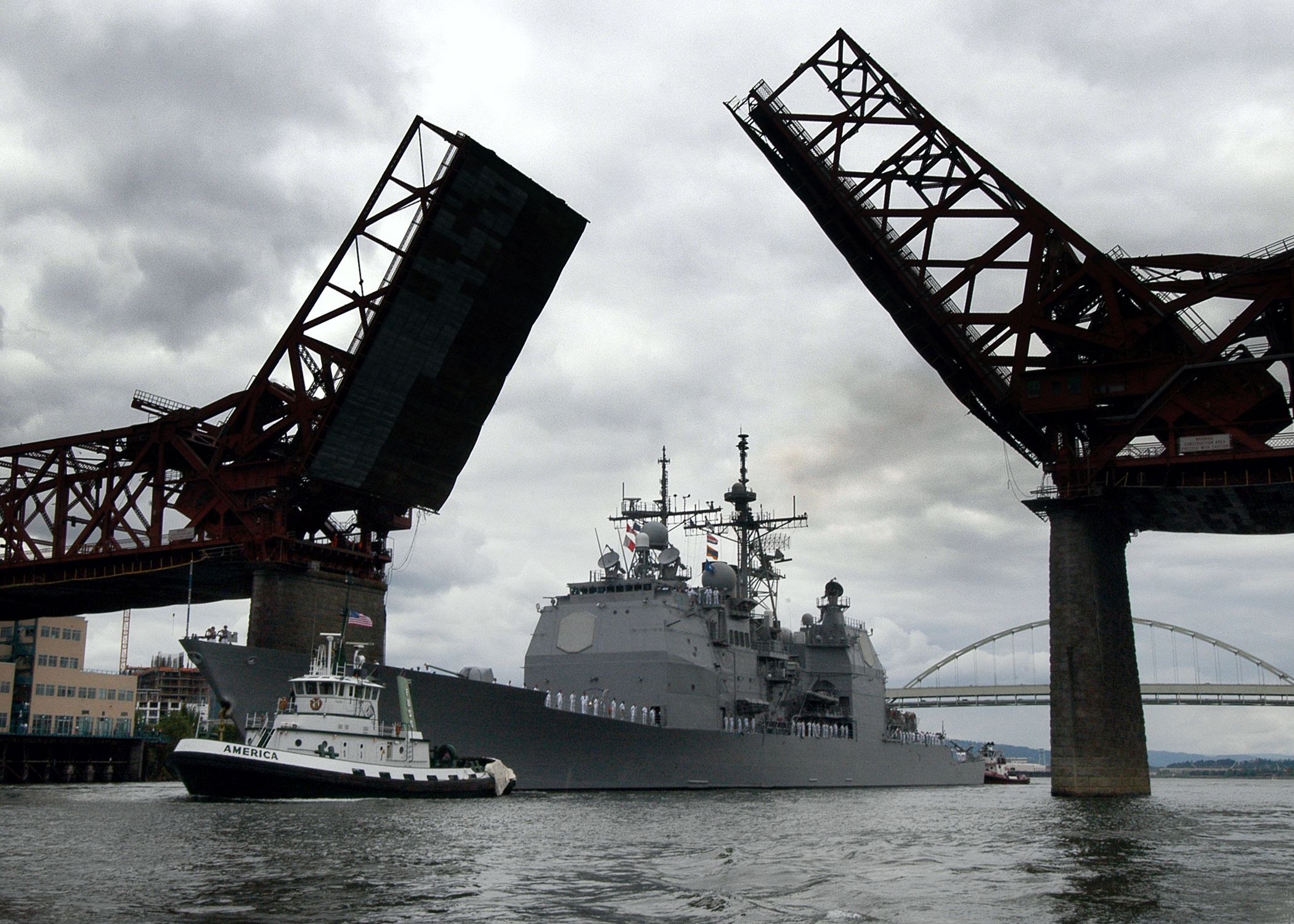 500k | USS Lake Erie (CG 70) makes her way up the Willamette River in to Portland, OR, for the 97th Annual Rose Festival, 10 June 2004. U.S. Navy photo by Photographer's Mate 1st Class Michael Larson. United States Navy News Stand. Photo # 040610-N-6901L-003. |