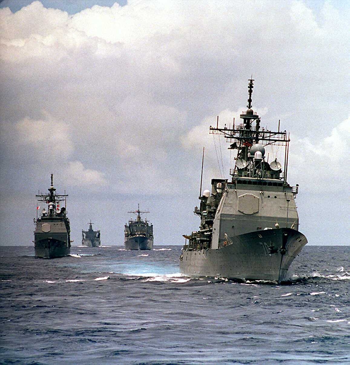 147k | The USS Lake Erie (CG 70) (right), USS Mount Hood (AE 29) (center), USS Cimarron (AO 177) (left) and USS Chosin (CG 65) (far left), conduct operations in the Pacific Ocean on 14 April 1997. The ships are part of the aircraft carrier USS Constellation battle group en route to the Persian Gulf to enforce no-fly zones and monitor shipping to and from the region. U.S. Navy photo #970414-N-4126O-001 by Petty Officer 3rd Class James W. Olive |