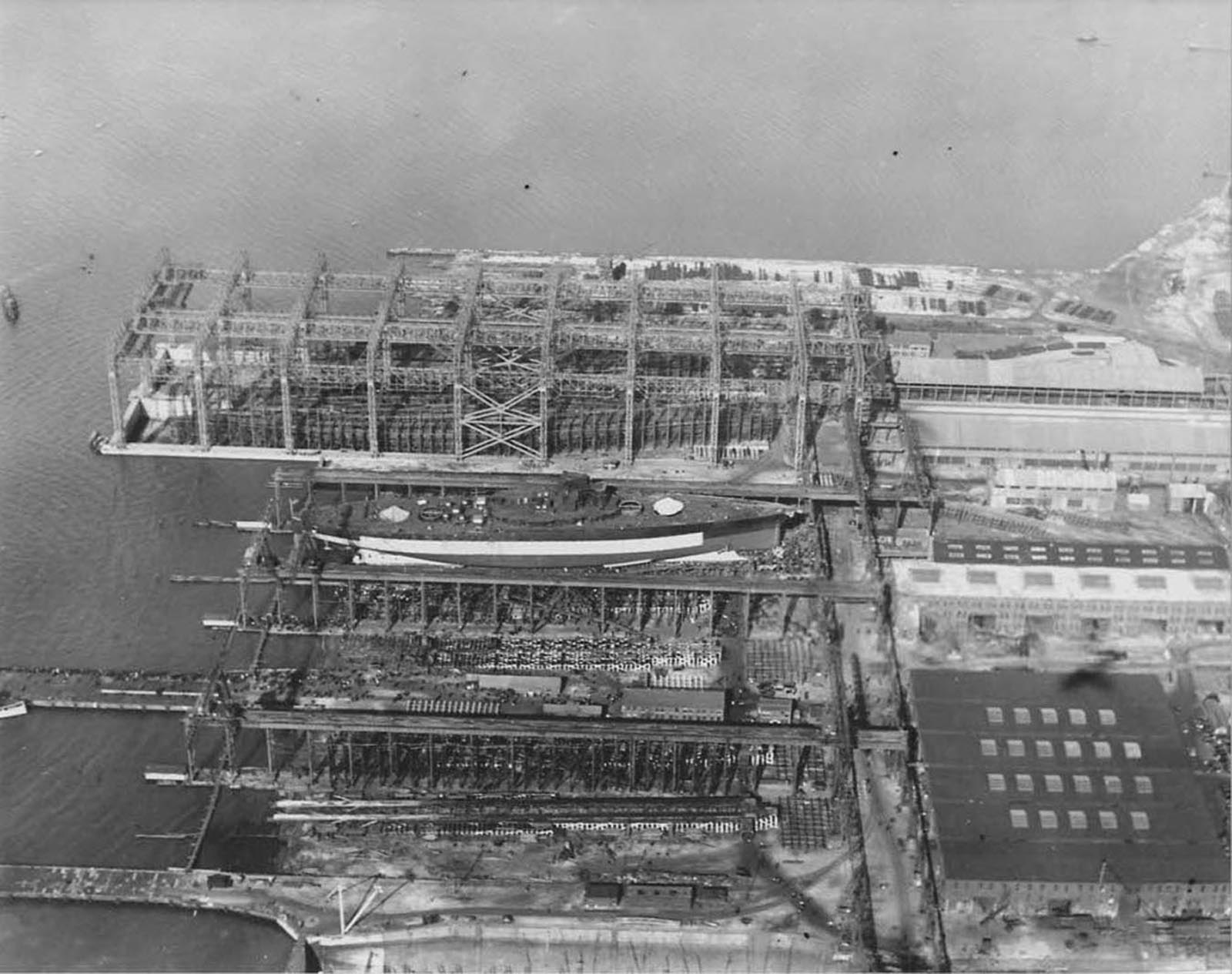 245k | Photo from the Newport News Shipbuilding and Dry Dock Company which shows the West Virginia (BB 48) on the shipway awaiting her launching 19 November 1921. One of the two large vessels being built on the ways behind her is most probably the South Dakota class battleship Iowa (BB 53), which would be cancelled 17 August 1923 in accordance with the terms of the Washington Treaty limiting Naval armaments. She was sold for scrap 8 November 1923. The photos of Iowa under construction clearly show her being built in the left-hand (western most) of the two covered ways. So this photo of West Virginia, looking toward the west, would show another ship in the nearer covered way and Iowa would be in the one farther away. Based on the shape of the scaffolding on the nearer covered way, the bow shape suggests warship rather than merchant, and the length would be consistent with one of the battlecruisers. Constellation (CC 2) would be more likely than Ranger (CC 4), based on the height of the scaffold, but that then begs the question of where Ranger was being built since she would have been too long for most of the open ways in the yard. Navsource, Friedman, and Breyer all agree that Constellation was laid down at Newport News in August of 1920. West Virginia was not launched until November 1921. Ranger was laid down in June of 1921, and so her construction (and scaffold height) would probably not have reached the level of that seen in the nearer covered way, based on the slower, peace time work schedule. | Text i.d. courtesy of Richard M. Jensen. Photo courtesy of Dale Hargrave. | |