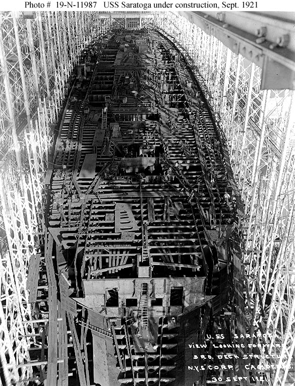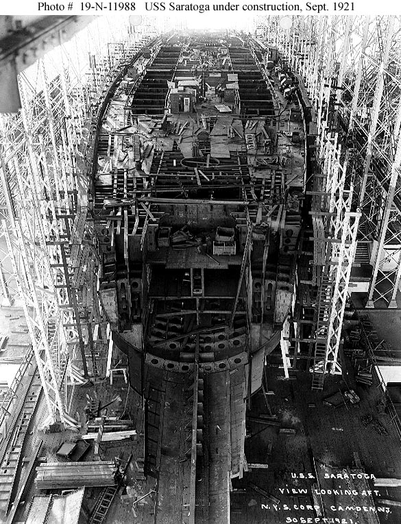 Under construction at the New York Shipbuilding Company shipyard, Camden, New Jersey, 30 September 1921. View looks aft from over the bow area. Photograph from the Bureau of Ships Collection in the U.S. National Archives #19-N-11988. |