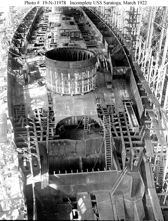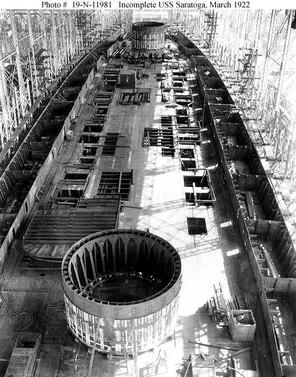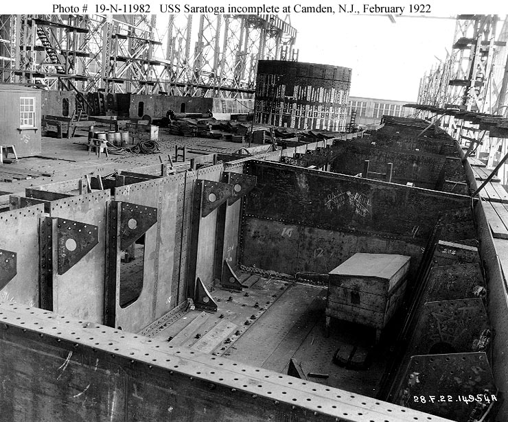 Under construction at the New York Shipbuilding Company shipyard, Camden, New Jersey, 28 February 1922. View was taken from the starboard side of the third deck, amidships, looking forward. Photograph from the Bureau of Ships Collection in the U.S. National Archives #19-N-11982. |