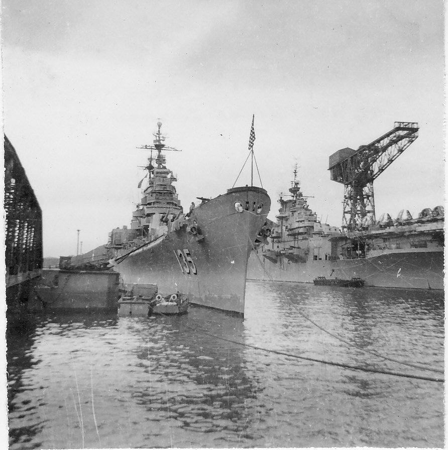 USS Los Angeles (CA 135) and USS Bon Homme Richard (CV 31) moored at Yokosuka, Japan, October 1951. Photo by N.A. "Stretch" Brown, Gunners Mate 3rd Class aboard Los Angeles. |